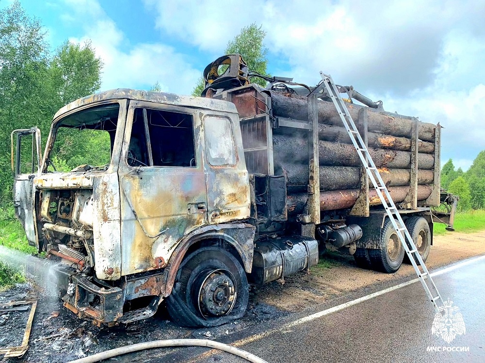 В Смоленской области на трассе «Дорогобуж — Ельня» на ходу загорелся гружённый древесиной лесовоз. Возгорание произошло в районе правого колеса, когда автомобиль двигался на базу.