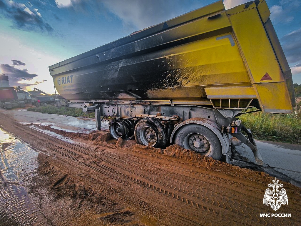 Инцидент произошел сегодня днем, 25 сентября, в Смоленске на улице Серебряная Гора. Грузовой автомобиль, следовавший по установленному маршруту, столкнулся с серьезной проблемой — у самосвала лопнуло колесо прицепа, что привело к возгоранию. Пламя стремительно распространилось на два колеса транспортного средства.