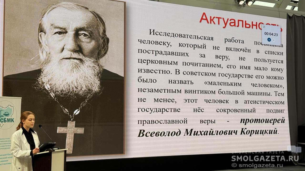 Директор Смоленского базового медицинского колледжа имени К.С. Константиновой Елена ЯСТРЕБОВА рассказала об истории конференции. Она отметила, что это уже 22-е по счёту мероприятие, посвящённое теме «Образ верного людям и Богу служения». Символично, что на главном слайде конференции изображён лик апостола и евангелиста Луки, ведь именно в честь него в колледже в 2003 году был открыт и освящён домовой храм.