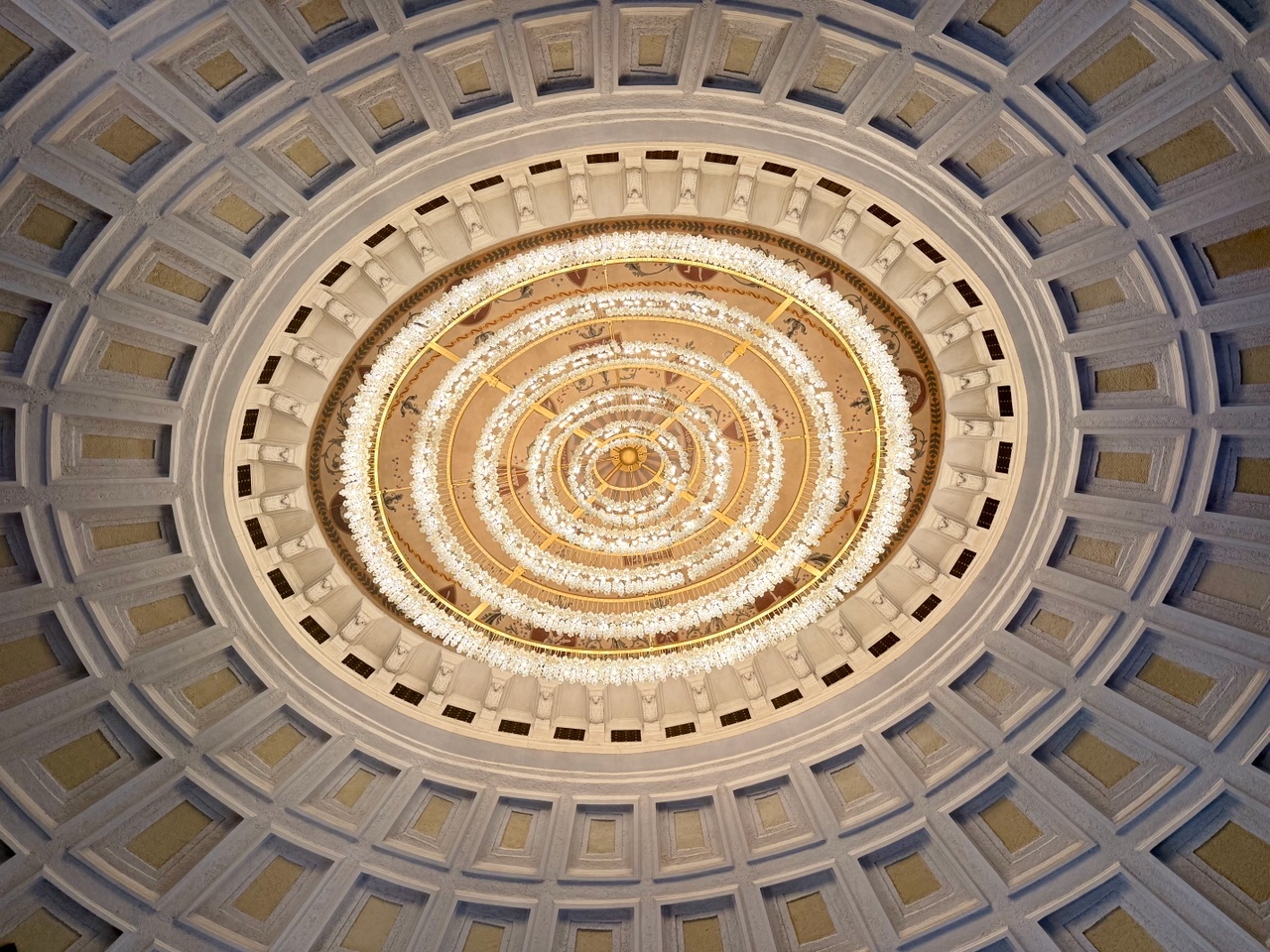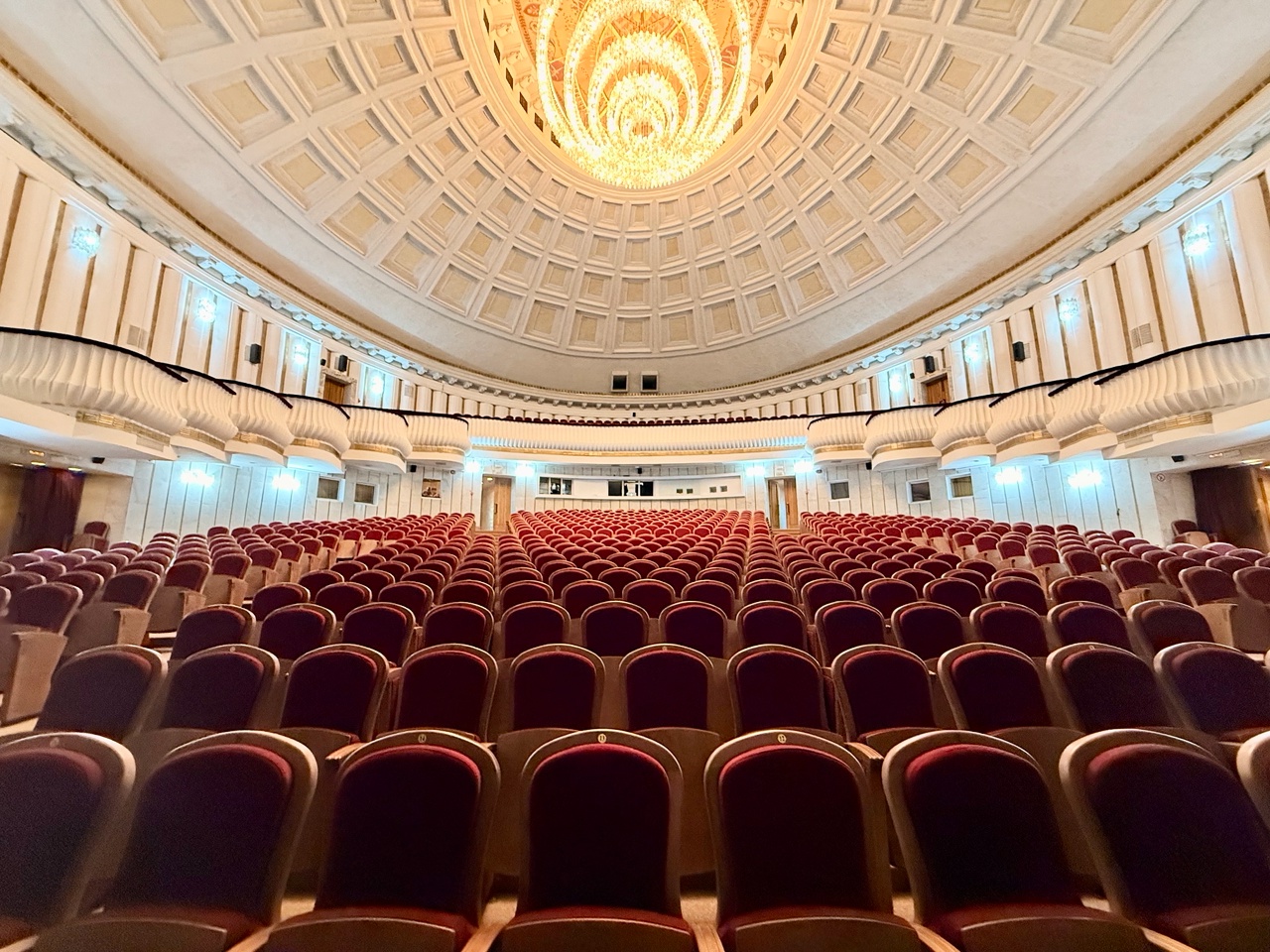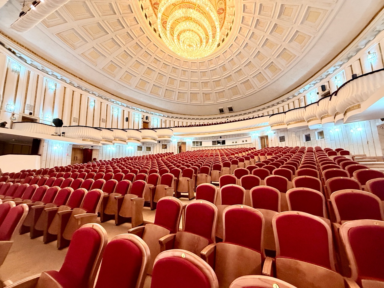 Один раз в театральный сезон на специальных тросах люстру опускают вниз, меняют лампочки, моют и поднимают вверх.