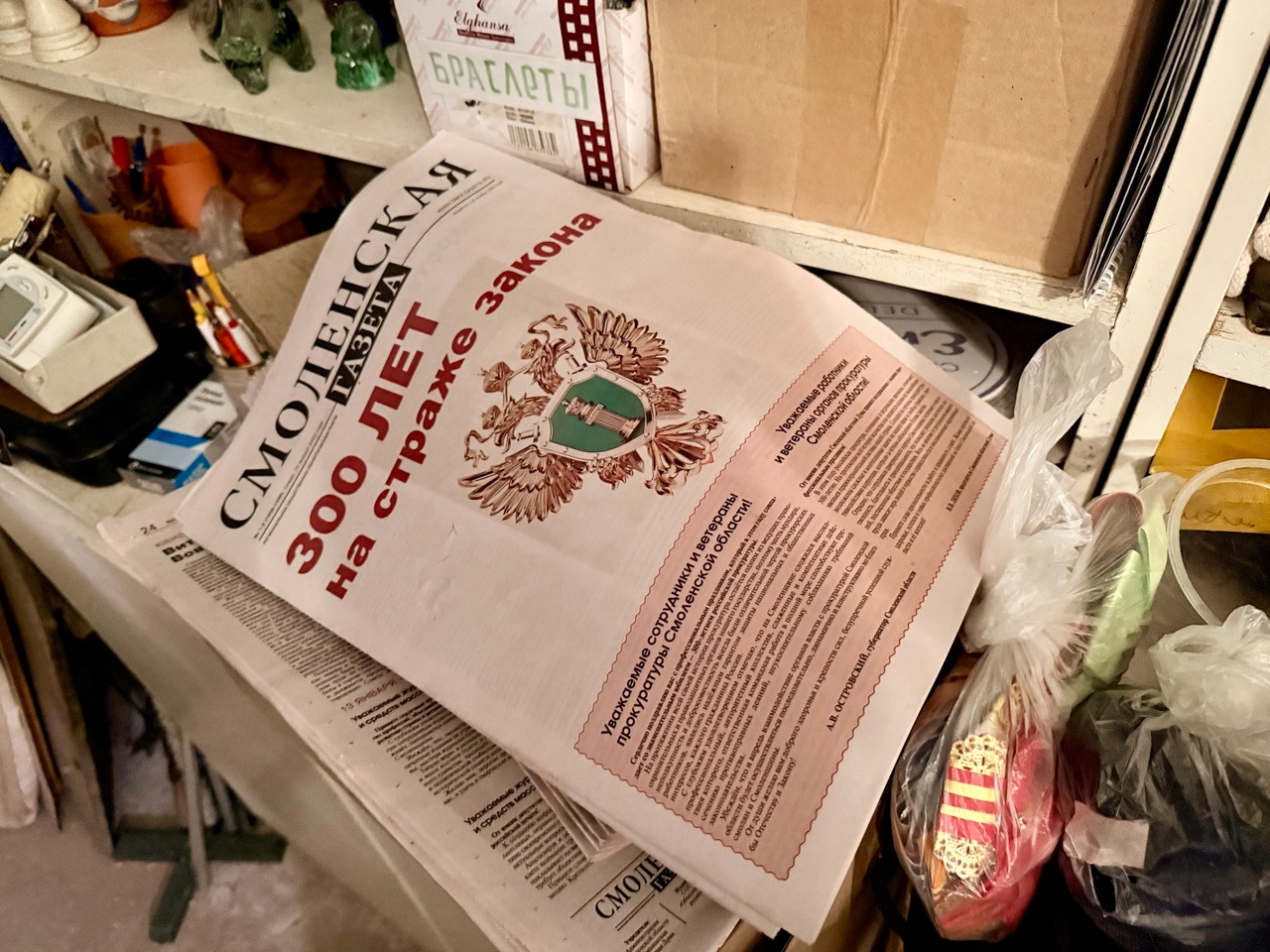 Реквизиторский цех – это сокровищница театра, в которой хранится множество очень любопытных вещей: книги, посуда, телефоны, лампы, зонты, цветы, шпаги, вазы и прочие предметы, используемые актёрами во время спектакля. У каждой вещи есть своё «штатное» место на полке, вешалке или в ящике. Среди прочих сокровищ почётное место занимает издание «Смоленская газета».