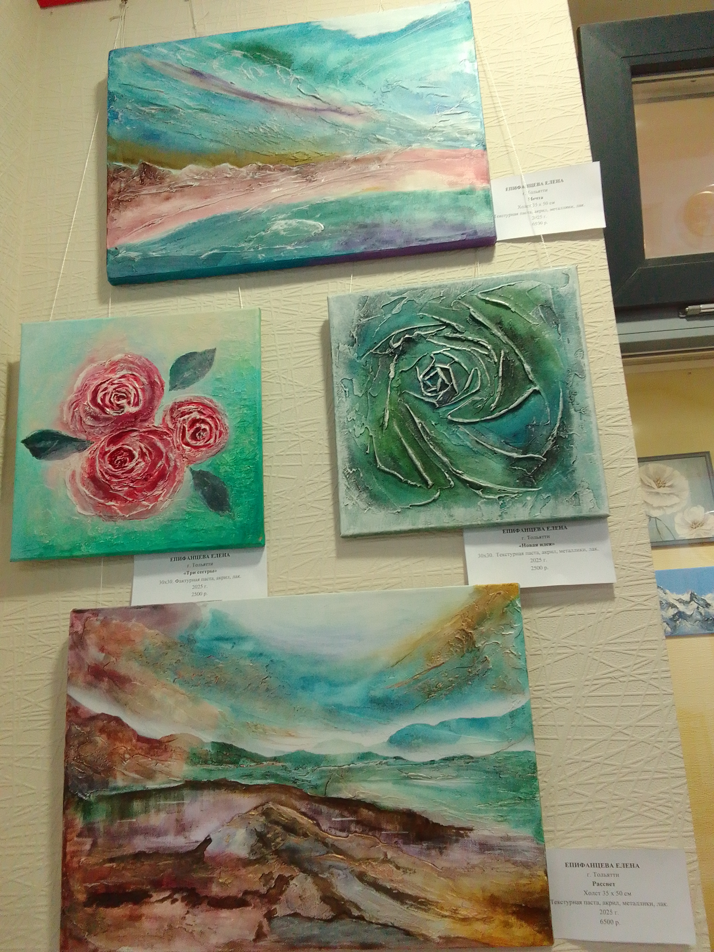 Смоленск представила Татьяна Кошелева. Художница в юности занималась оформлением стенгазет. Художественного образования не имеет, но имеет огромную тягу к творчеству и массу позитивной энергии. Трудилась в Смолоблпотребсоюзе, служила в органах. В 2024 году прошла интернет-курс по фактурной живописи и «заболела» этим видом творчества. Прошла также курсы «Цветение», «Интерьерный художник». Теперь и сама проводит мастер-классы. За время чуть более года создала около 200 работ, участвовала в различных выставках. Данная выставка для неё юбилейная – десятая. Зритель полюбил работы художницы – ей делают индивидуальные заказы, а отдельные её работы ушли в частные коллекции.