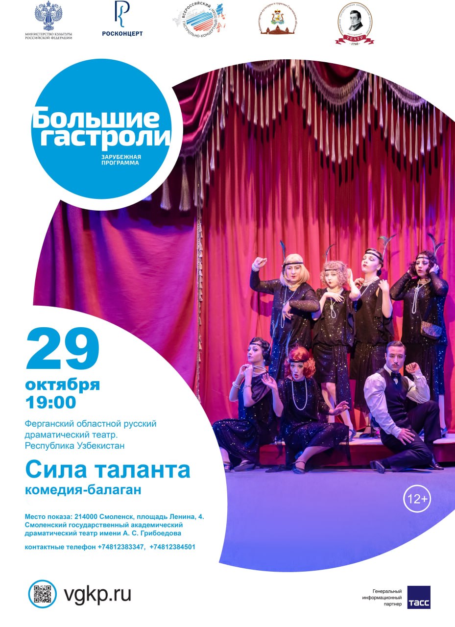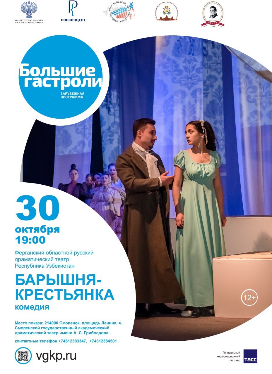 29-30 октября в Смоленске пройдут гастроли Ферганского областного русского драматического театра. Театральная труппа из Узбекистана представит смолянам две комедии. Гастроли организованы в рамках зарубежного направления программы «Большие гастроли» Минкультуры России.