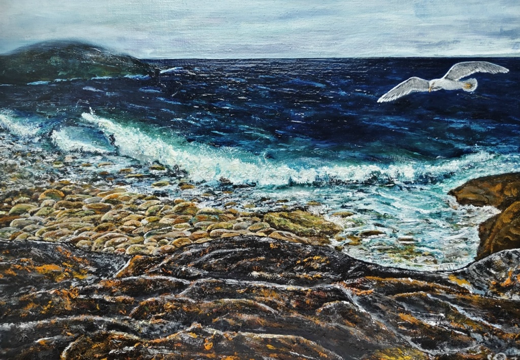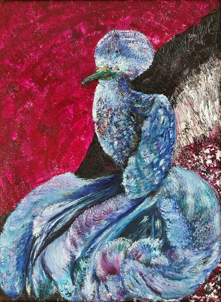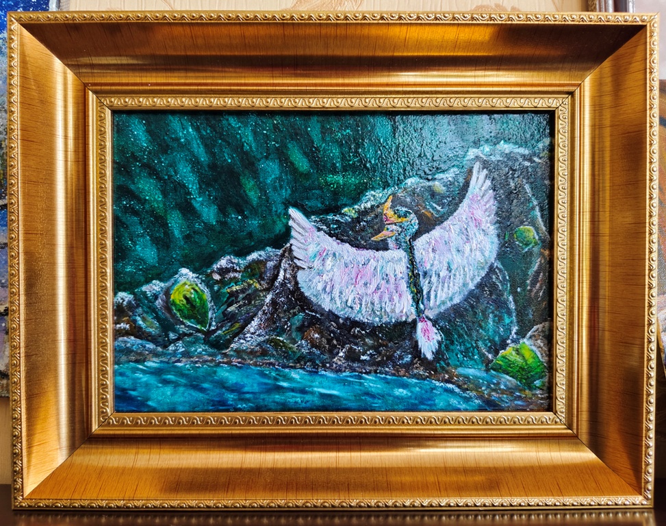 – Подруга попросила написать орла для рабочего кабинета. Я покопалась в своих референсах из Кабардино-Балкарии, написала орла. И мне стало грустно, что он летает один. Решила дописать к нему подругу – «Птицу счастья», сидящую на жеоде аметиста. Почему маленький формат? Потому что картина создавалась для любителей живописи, ищущих картину-друга,с которой можно посидеть за столом, за чаем, созерцать, изучать. Такой новый вид интеллектуальной деятельности. Людям нужна сказка.