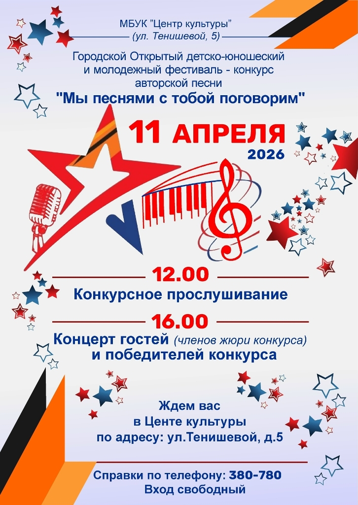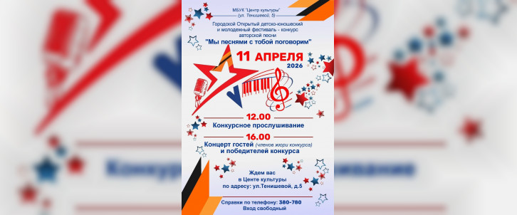 11 апреля в Смоленске, в Центре культуры на улице Тенишевой, состоится второй Открытый детско-юношеский и молодёжный фестиваль-конкурс авторской песни «Мы песнями с тобой поговорим».