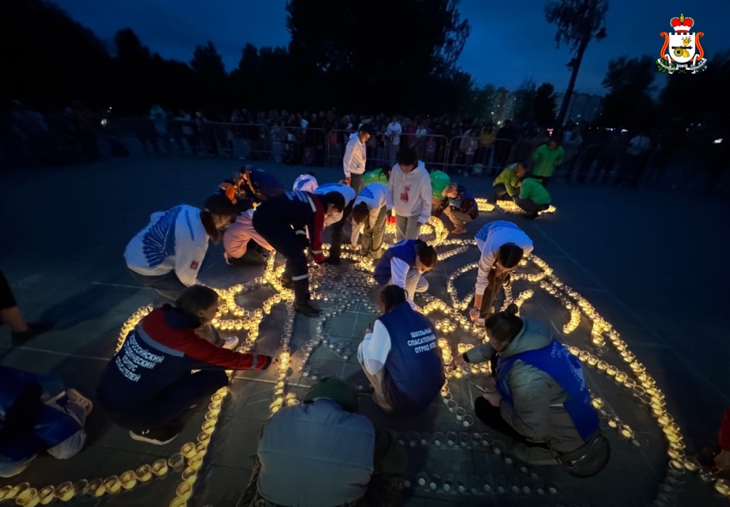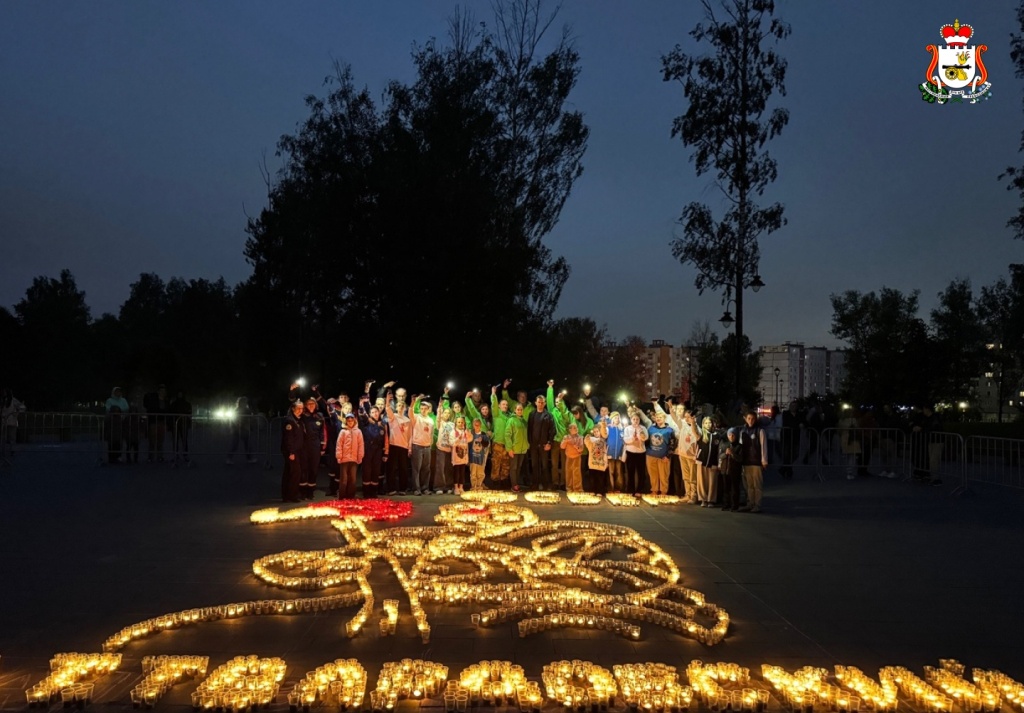 Из сотен свечей волонтёры собрали портрет Героя Российской Федерации Ивана Флёрова, изображение легендарной боевой машины «Катюша» и красную звезду.