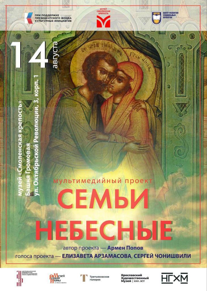 14 августа в башне Громовой, входящей в комплекс музея «Смоленская крепость», пройдёт презентация и показы мультимедийного проекта «Семьи небесные» – уникального анимированного кинорассказа о семьях святых, созданного на основе шедевров русского религиозного искусства. В течение дня в башне Громовой будут проходить специальные показы, открытые для всех желающих. Проект представит его автор и руководитель – Армен Попов, директор АНО «Центр развития социальных проектов». Презентацию проекта в музее «Смоленская крепость» благословил митрополит Смоленский и Дорогобужский Исидор.