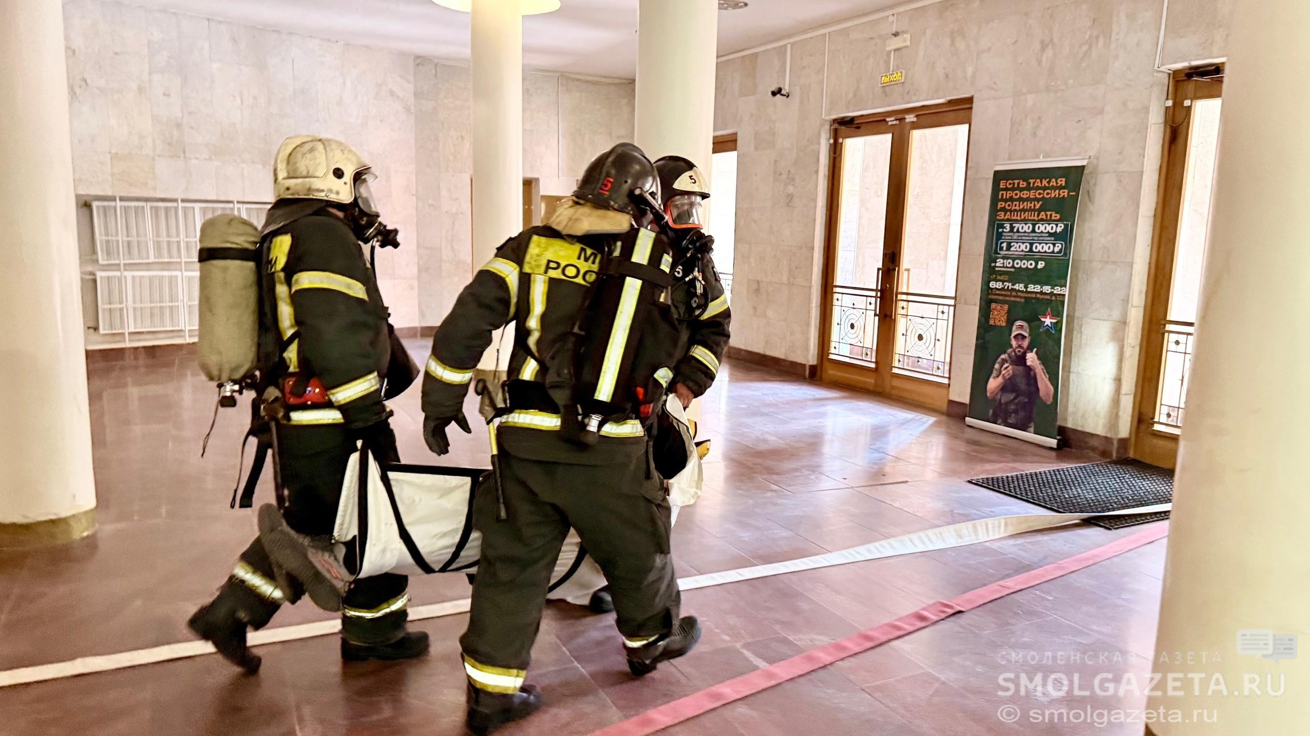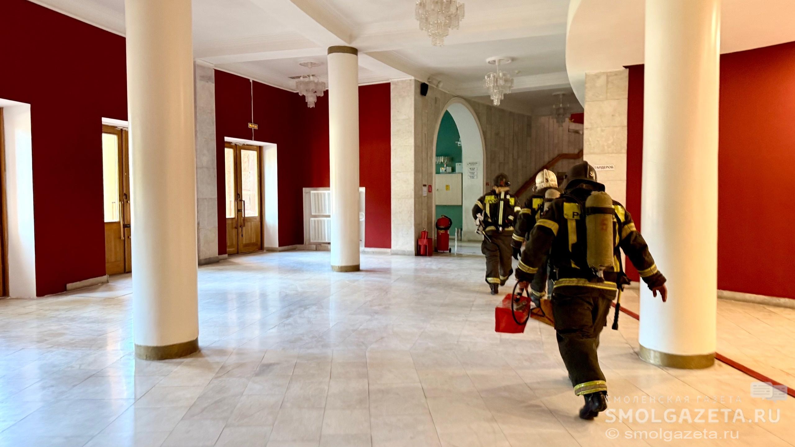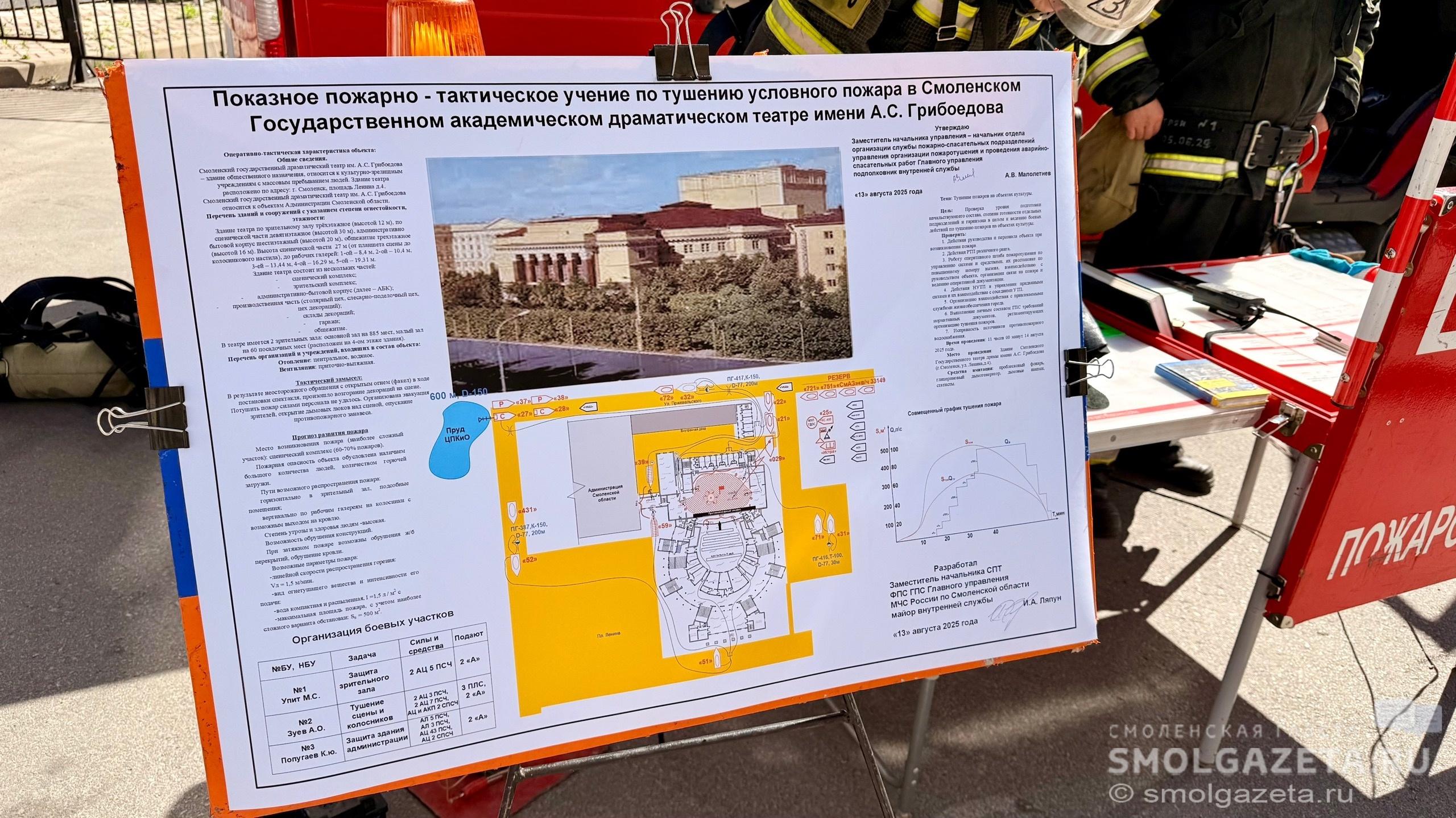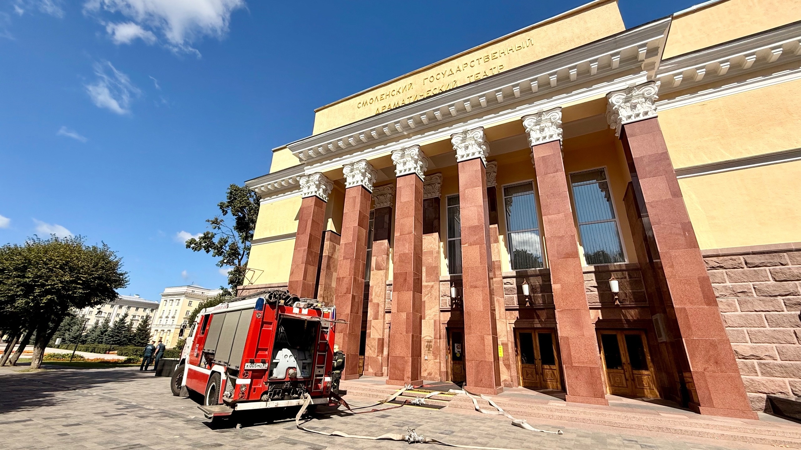 «Сегодня производились пожарно-тактические учения на здании драматического театра имени Грибоедова. Привлекался гарнизон пожарной охраны города Смоленска. Все мероприятия руководством объекта были выполнены в полном объёме. Пожарные подразделения со своими задачами справились: были выполнены в полном объёме все мероприятия, которые были задуманы согласно этим учениям.