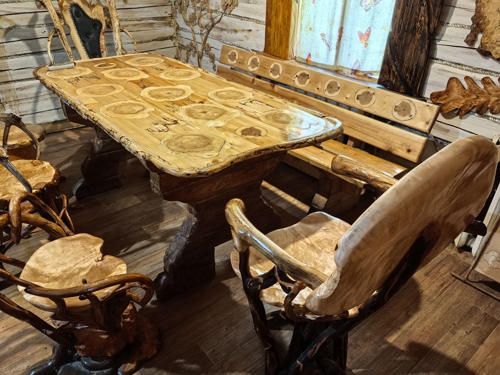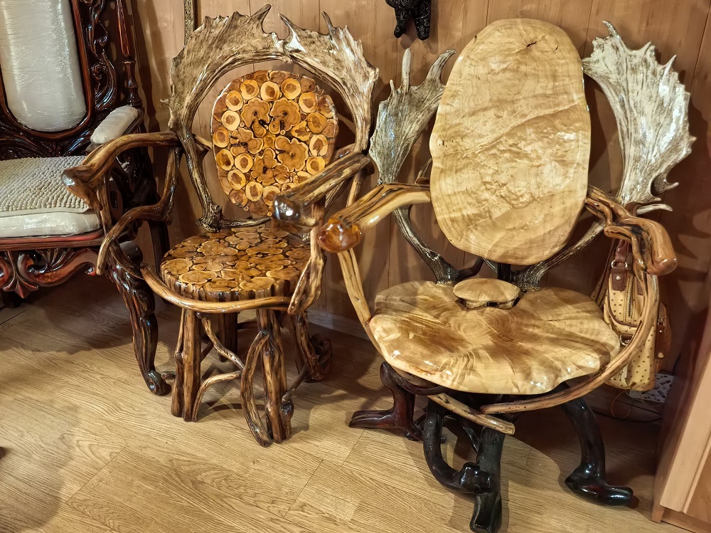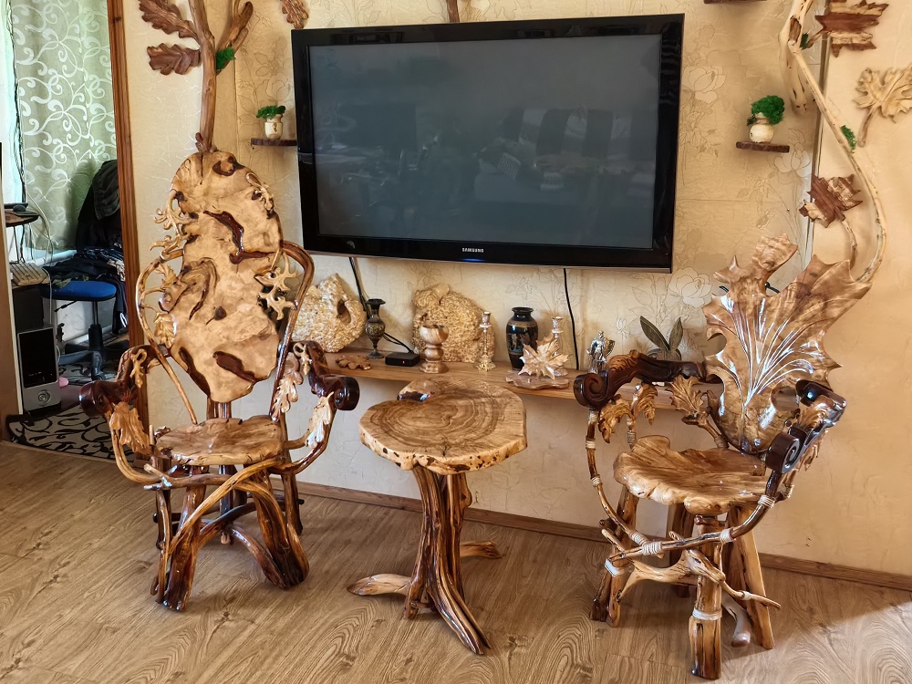 Это было настоящее откровение. Мы ахнули, едва увидев, чем украшен интерьер дома. Фигурные стулья и троны, восхитительные столы и кухонная утварь, картины и панно вызывали восхищение и удивление. А наш собеседник обыденно рассказывал, как какое-то время назад почувствовал тягу к деревянному творчеству и материалам, которые называются капакорень и сувель — и то, и другое — наросты на древесном стволе. Капом или капокорнем называют шишковатый округлый нарост, образованный спящими почками и измененными волокнами древесины. Встречается он достаточно редко, иногда на стволе, иногда на корне. Срезать его с живого дерева нельзя — чаще всего это приводит к гибели самого дерева, поэтому обычно кап ищут на лесоповале. Сувель же — это болезнь дерева, нарушение развития годовых колец. Кольца дерева деформируются, «вспучиваются», образуя гладкий шарообразный или каплеобразный наплыв на стволе. Сувель (свиль) удалять можно, но место среза необходимо обязательно обработать садовым варом, краской или глиной, чтобы сберечь растение. Сувель встречается гораздо чаще капа, может иметь очень большие (до двух метров) размеры. Многие видели затейливые наросты на березах, кленах и других деревьях, но лишь избранные способны разглядеть их особое предназначение и манящую красоту.