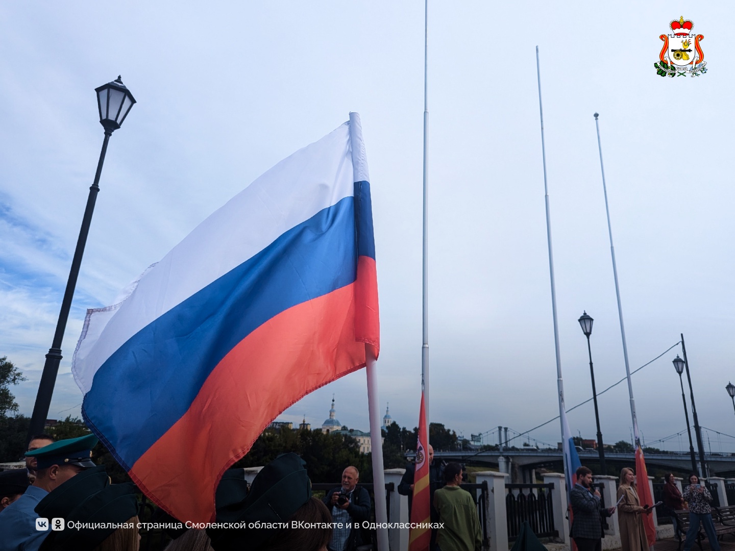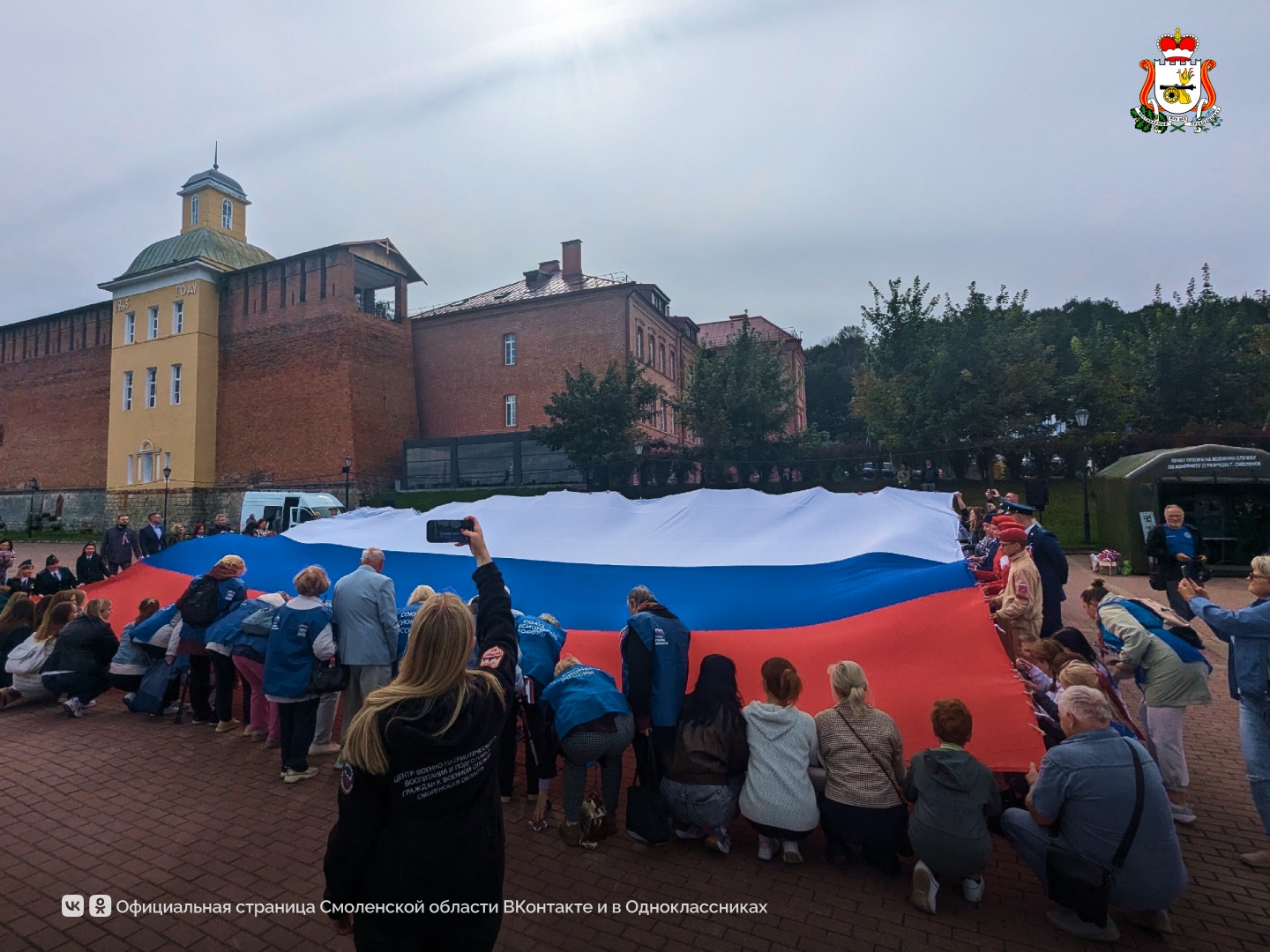 В торжественной патриотической акции приняли участие ветераны специальной военной операции, представители администрации региона, правоохранительных органов, волонтёры и активные смоляне. Особую атмосферу праздника создало развёртывание масштабного полотнища Государственного флага России размером 10×15 метров.