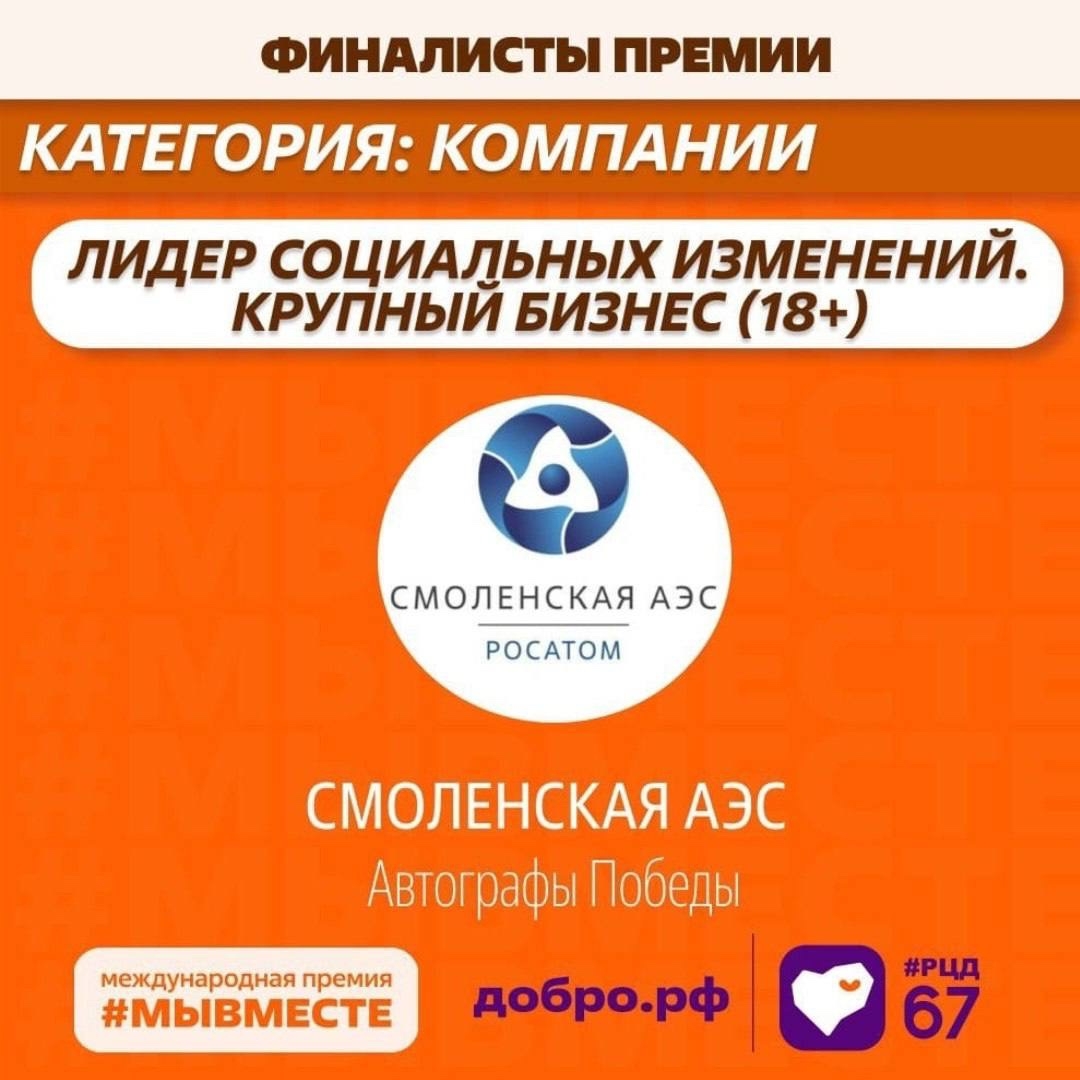 В этом году в финал вышли 90 проектов из 23 стран и 31 региона России, среди которых и работа смолян. Смоленская атомная станция представила инициативу под названием «Автографы Победы!» в категории «Лидер социальных изменений. Крупный бизнес (18+)».