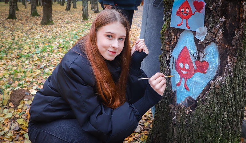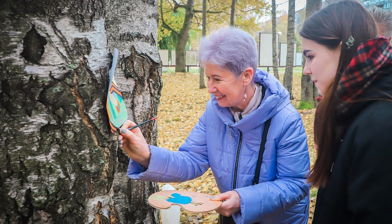 С помощью кисти и красок волонтёры превратили деревья с «лунками» на стволах в парке 2 микрорайона в яркие визуальные истории о главных социальных проектах города: донорстве, экологии, патриотизме, инклюзии, помощи детям и зооволонтёрству.