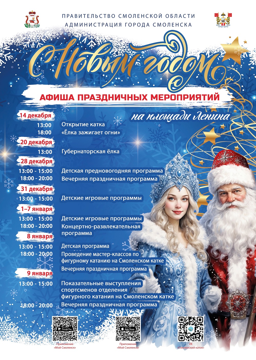 В Смоленске новогодние мероприятия стартуют с 14 декабря и пройдут на площади Ленина. Региональное министерство культуры и туризма поделилось соответствующей афишей.