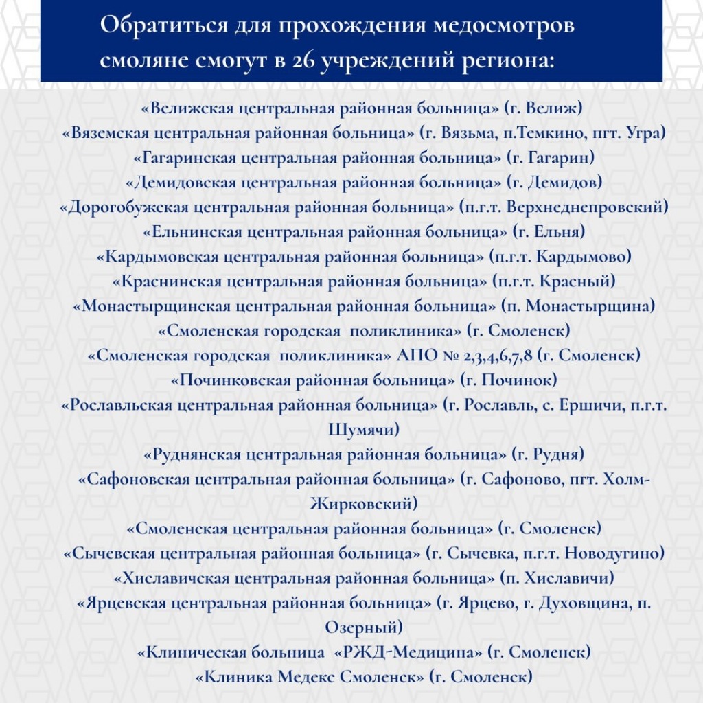 Губернатор Смоленской области Василий Анохин сообщил о продолжении масштабной программы профилактических осмотров населения. Во всех муниципальных округах региона организована возможность пройти диспансеризацию и другие виды профилактических исследований.