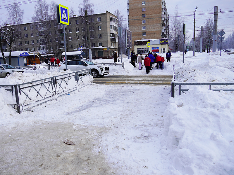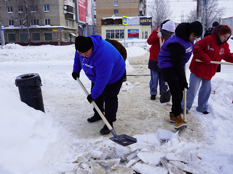 Основное внимание добровольцев было уделено расчистке пешеходного перехода, который пересекает две дороги и трамвайные пути. С обледенелыми сугробами боролись с помощью с помощью штыковых и совковых лопат.