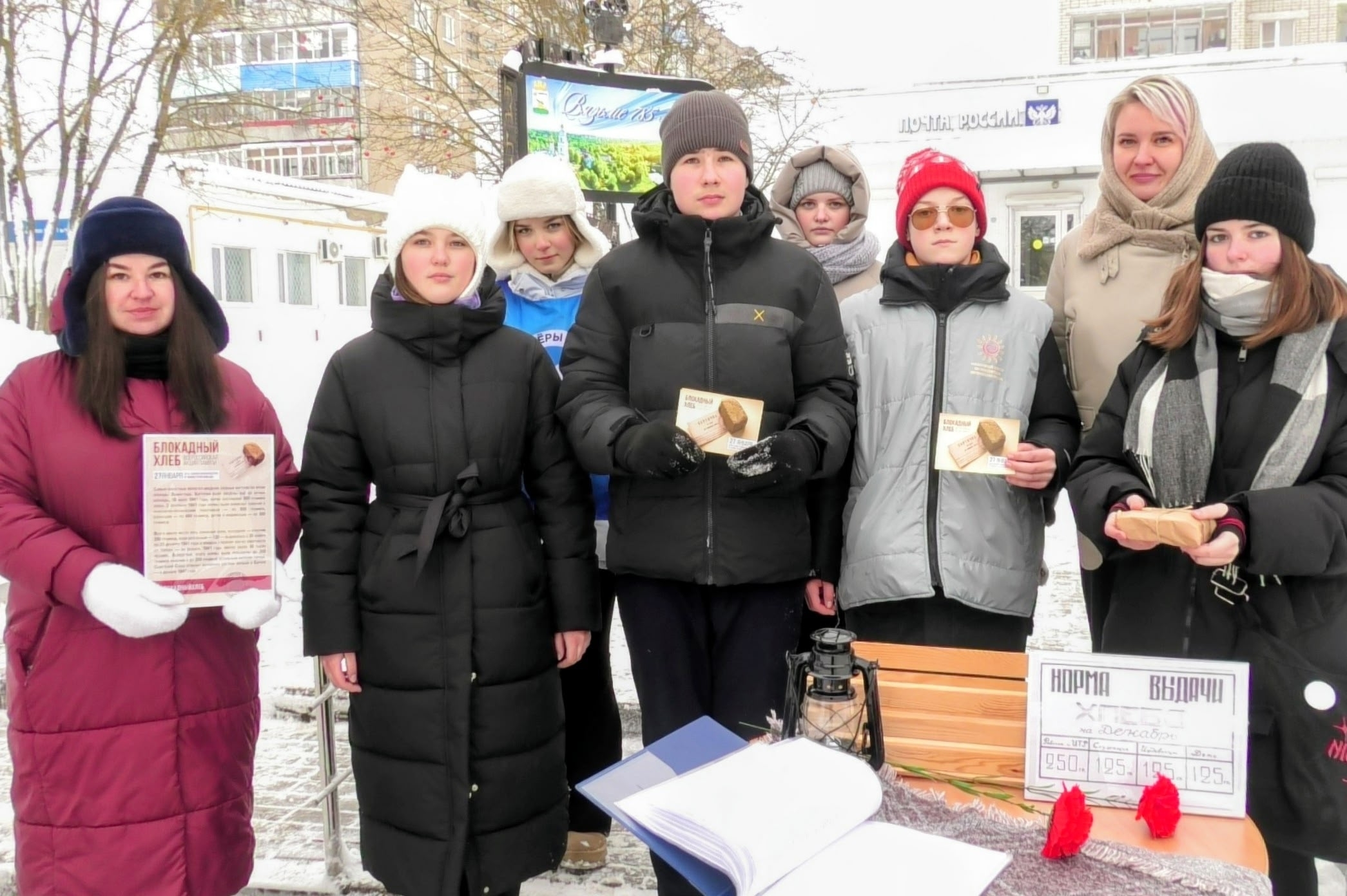 В Вязьме прошла Всероссийская акция памяти «Блокадный хлеб». Волонтёры раздавали горожанам блокадный паёк – небольшой кусочек хлеба весом 125 грамм.