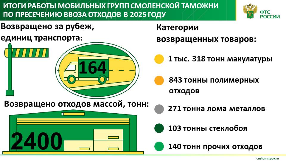В результате работы мобильных групп отдела контроля за ввозом и оборотом товаров (ОКВОТ) было выявлено и задержано 164 транспортных средства, перевозивших в общей сложности 2675 тонн различных видов отходов.