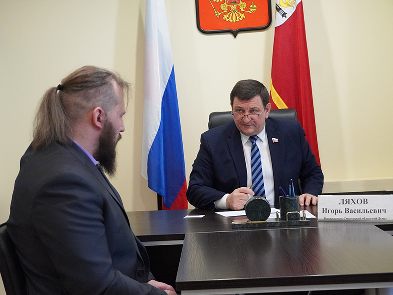 На приём к Игорю Ляхову пришёл командир поискового отряда «Крепость», представитель команды парка военно-исторической реконструкции «Смоленский рубеж» Максим Кузнецов и вручил председателю почётную грамоту, поблагодарив его за активное участие в областных патриотических мероприятиях. Кроме того, он пригласил парламентария на патриотический праздник «В боях на смоленской земле», который состоится 22 февраля в парке военной истории «Смоленский рубеж». Игорь Ляхов обсудил с ним вопрос проведения в деревне Рыбки Сафоновского округа реконструкции боя Афганской войны.