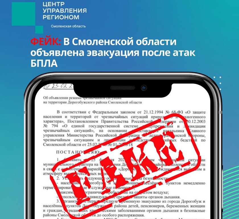 По электронным почтам распространяется «документ», якобы подписанный губернатором Смоленской области. Он предписывает, в частности, организовать эвакуацию части жителей Дорогобужа и близлежащих населённых пунктов после атаки на ПАО «Дорогобуж».