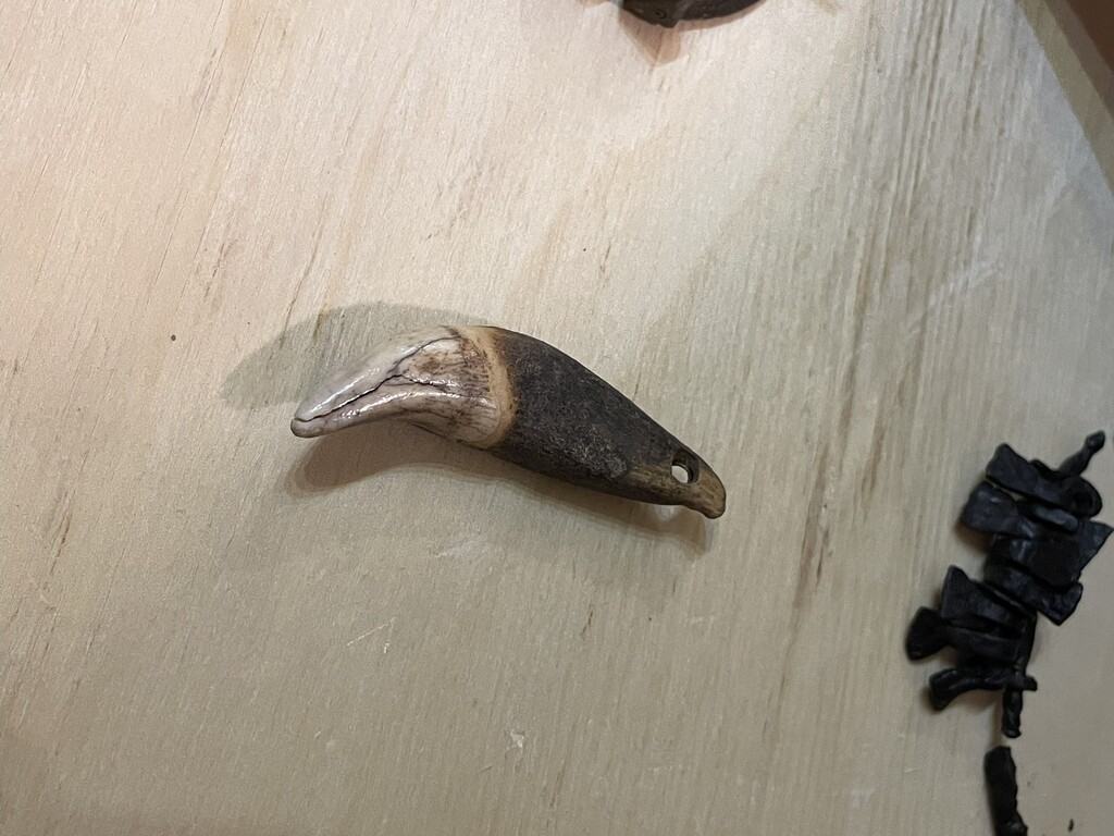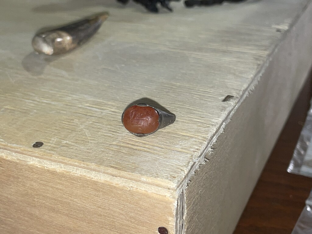 На импровизированную витрину археологи также выложили языческую подвеску, выполненную из медвежьего клыка (она, к слову, уже находится в музейной экспозиции), накладки на сундук, небольшой замок, на котором отчётливо видна скважина для небольшого ключа, наконечники стрел, гривну (украшение) с амулетами – молоточками Тора. Рядом с ними – перстень со вставкой из сердолика, на котором изначально была нанесена надпись на арабском языке. Учёные, сообщил археолог, прочитали её как «Во славу Аллаха». Вероятно, уже в Гнёздове надпись переделали в рисунок животного, конечно, схематический, но напоминающий оленя или лося.
