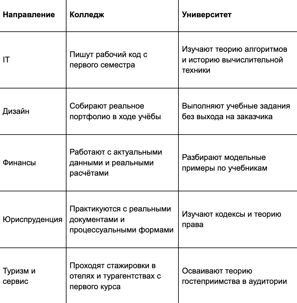 Классическая университетская модель строится иначе: сначала несколько лет общих фундаментальных дисциплин, потом специализация, и только после – контакт с реальными задачами профессии. В колледже такой очерёдности нет. Разница в подходе наглядна по конкретным направлениям: