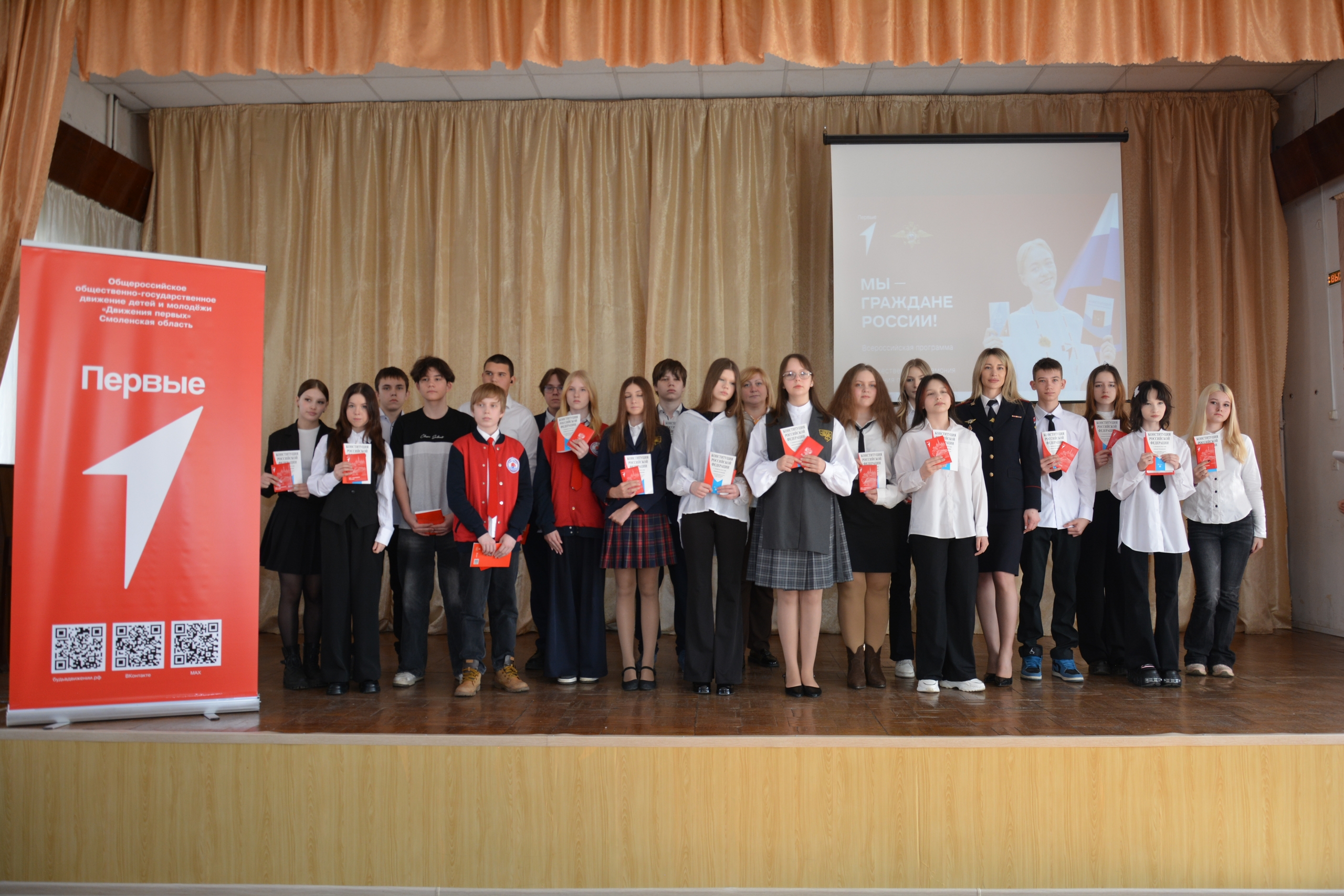 Сотрудники отдела по вопросам миграции УМВД России по городу Смоленску совместно с представителями «Движения первых» вручили подросткам не только паспорта, но и ценные подарки: брошюры с текстом Конституции Российской Федерации и значки с символикой молодёжного движения.