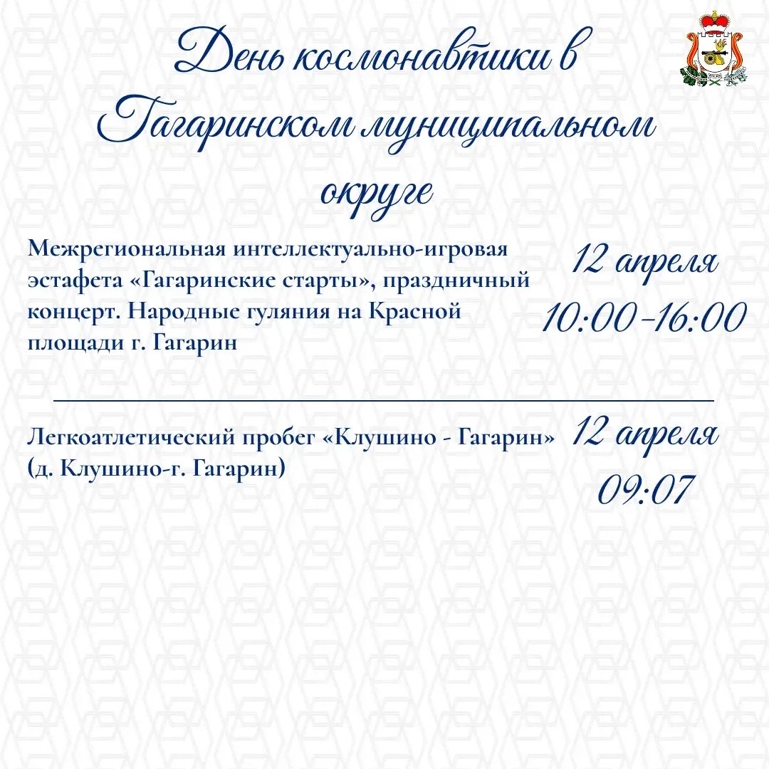 Масштабные праздничные события пройдут и в муниципальных образованиях. С особым размахом юбилейную дату отметят в Гагаринском округе – на родине первого космонавта планеты. Здесь запланированы легкоатлетический пробег «Клушино – Гагарин», народные гуляния на Красной площади окружного центра, квест «Под Гагаринской звездой», межрегиональная интеллектуально-игровая эстафета «Гагаринские старты», «Гагаринский диктант», праздничные концерты и торжественные митинги.