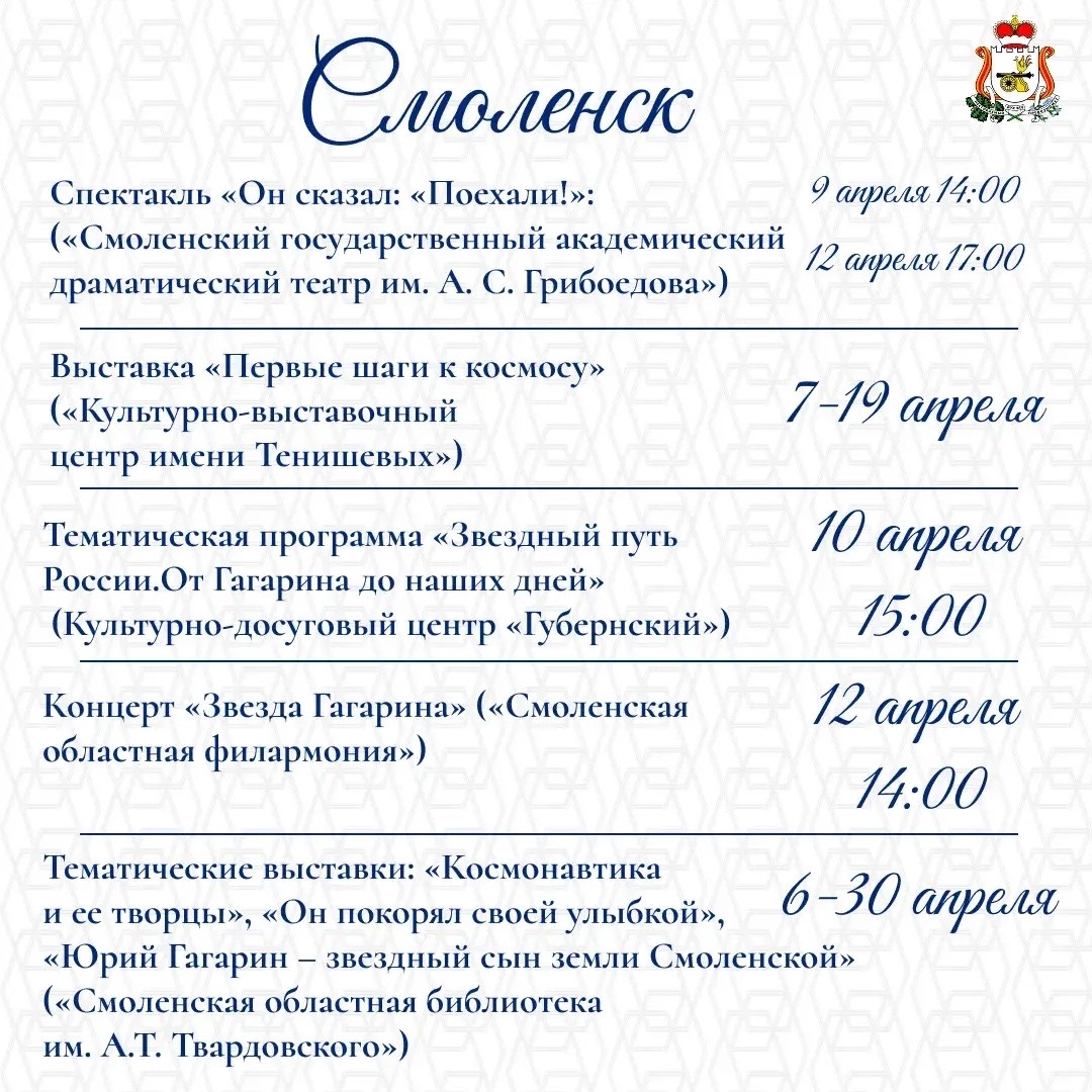 В честь 65-летия со дня первого полёта человека в космос в Смоленской области жителей и гостей региона ждёт насыщенная программа культурных и просветительских событий.