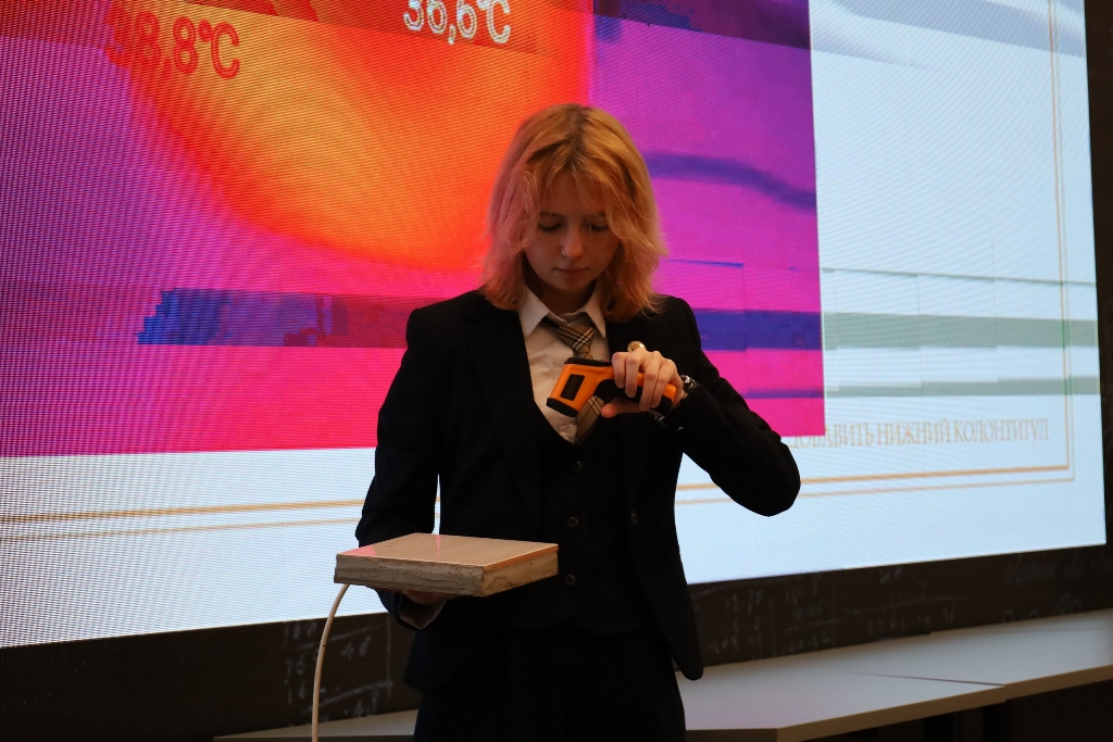 Затем Эвелина Жевнова из Многопрофильного лицея продемонстрировала зрителям нагревательный прибор, который она сделала сама. «Я решила сделать свой обогреватель, потому что это актуально для нас. В нашем регионе осенью, когда на улице уже холодно, а центральное отопление ещё не включили, многим приходится пользоваться обогревателями. Обогреватели бывают десяти видов, я каждый изучила и пришла к выводу, что самый безопасный – это керамический обогреватель, так как керамика не подвержена возгоранию. Тогда мне пришла идея, что можно сделать свой нагревательный прибор из керамической плитки и саморегулирующегося нагревательного кабеля. Сделала, работает, сегодня все сами в этом убедились. Пока шло мероприятие, он был включен в сеть, и можно было проверить, что он был тёплый», – поделилась Эвелина.