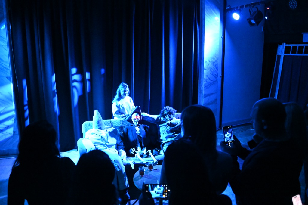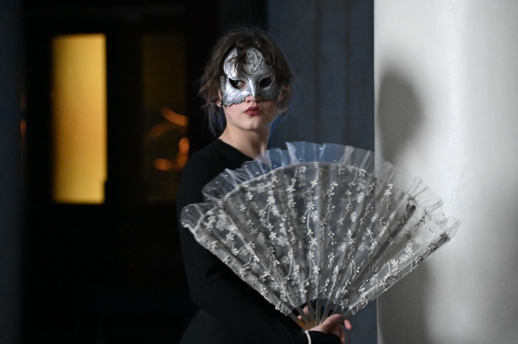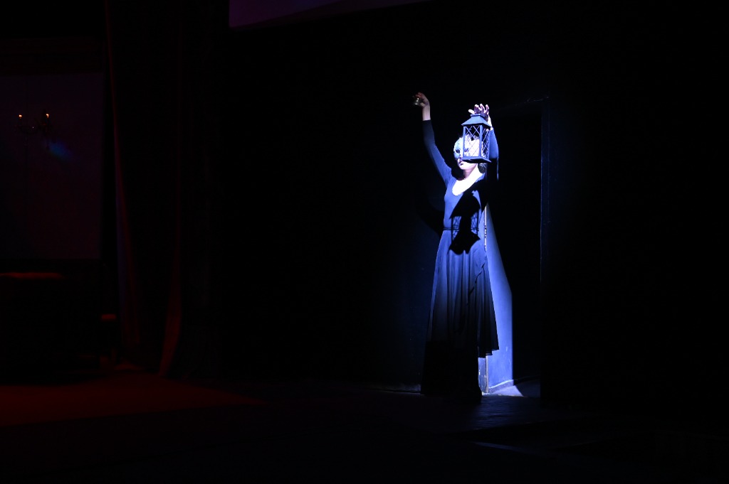 Говорят, что ночью в Смоленской драме начинается другая жизнь, где оживают шорохи и эхо, колышутся занавески и тени, и даже могут наблюдаться перемещения вещей и загадочных молчаливых фигур. Вот кавалеры скрещивают шпаги, дамы танцуют с веерами, а тут флибустьер управляет «Эспаньолой». Вдалеке девушка прогуливается с зонтиком. А вот и ускользающая хозяйка хрустального колокольчика. В телефонной будке не может дозвониться нетерпеливый поклонник. У костра греется озябший путник. Факелоносцы зовут вверх по лестнице. Красавица готовит инсталляцию, а таинственная фигура не может устроиться на сказочном троне…