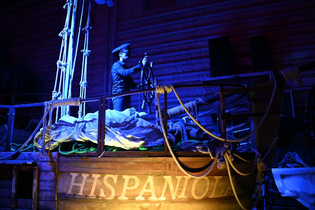 Сцена, наверное, главная достопримечательность, которую хочется рассматривать до дыр. Чего здесь только нет, от реквизита до подъемных механизмов, теряющихся в бездне над головой. В самой глубине, словно на рейде, застыла «Эспаньола» из спектакля «Остров сокровищ», рядом не менее колоритный образ – тяжелый пьедестал с фигурой всадника – придуманный для постановки древнегреческой трагедии. Кстати, в «Электре» много технических особенностей, делится проводник: яркая машина, журчащий родник, вся сцена покрыта толстым слоем «земли».