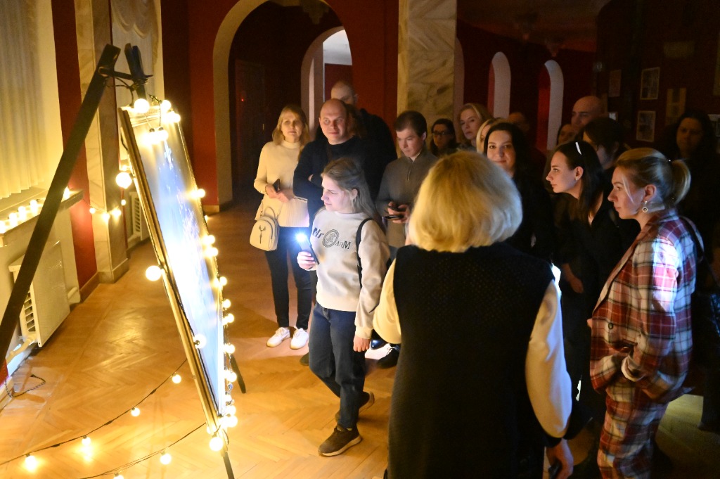 - Мы начинаем, включите фонарики на телефонах, - словами и жестами проводник – руководитель литературно-драматургической части театра Елена Киреева, приглашает следовать за собой, рассказывая о театре, ориентируя посетителей в нужном направлении.