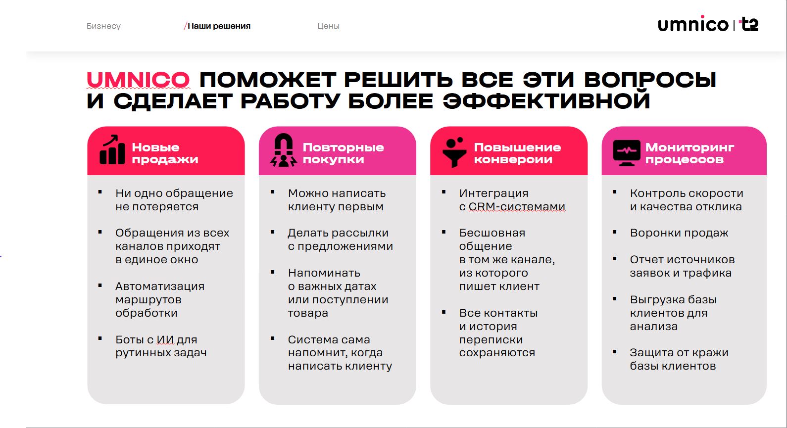 «Развитие цифровых сервисов для бизнеса остается одним из ключевых направлений T2. Компания последовательно расширяет линейку решений, предлагая инструменты для повышения эффективности коммуникаций и роста продаж. Платформа Umnico ориентирована в том числе на малый и средний бизнес, которому важно быстро внедрять понятные и масштабируемые цифровые продукты без сложной интеграции и дополнительных затрат».
