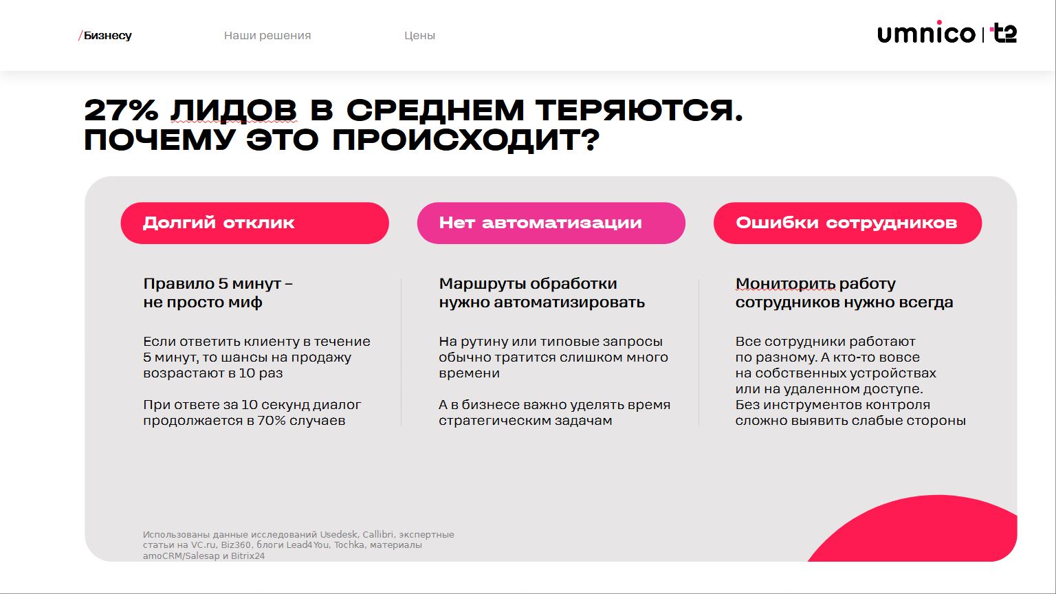 В рамках форума «Частное образование» руководитель отдела по развитию корпоративного бизнеса Т2 Николай Шлапаков рассказал о ключевых вызовах, с которыми сегодня сталкивается бизнес. По отраслевым оценкам, до 27% лидов теряются из-за несвоевременных ответов, отсутствия автоматизации и недостаточного контроля за работой сотрудников. При этом скорость реакции напрямую влияет на продажи: если ответить клиенту в течение пяти минут, вероятность сделки возрастает в несколько раз.