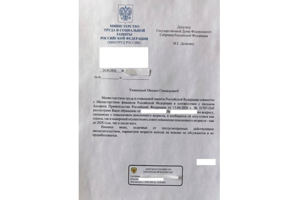 «Министерством труда и социальной защиты Российской Федерации совместно с министерством финансов Российской Федерации lt;...gt; рассмотрено ваше обращение по вопросу, связанному с повышением пенсионного возраста, и сообщается об отсутствии как планов, так и намерений осуществлять новое повышение пенсионного возраста - как до 2028 года, так и после него», - говорится в документе.