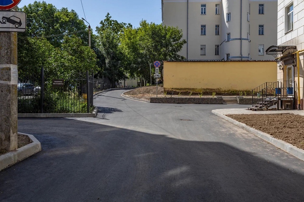 В первом дворе уложили двухслойное асфальтовое покрытие, обустроили пешеходные дорожки, оборудовали контейнерную площадку, установили подпорные стенки из габионов, высадили туи и кизильник.