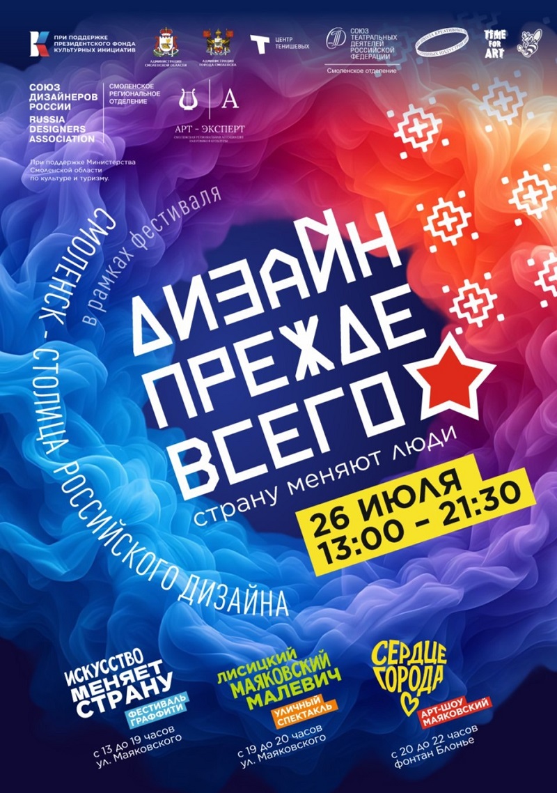 26 июля в Смоленске пройдёт фестиваль современного искусства и дизайна «Дизайн прежде всего / Страну меняют люди / Искусство меняет страну». Мероприятия фестиваля будут проходить с 13:00 до 19:00 на улице Маяковского и продолжатся в саду Блонье с 20:00 до 21:30.
