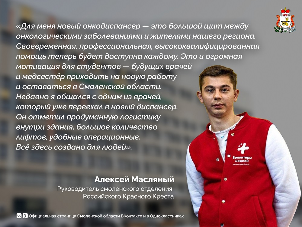 Руководитель смоленского отделения Российского Красного Креста Алексей Масляный прокомментировал открытие в Смоленске нового онкодиспансера: «Для меня новый онкодиспансер — это большой щит между онкологическими заболеваниями и жителями нашего региона. Своевременная, профессиональная, высококвалифицированная помощь теперь будет доступна каждому. Это и огромная мотивация для студентов — будущих врачей и медсестёр приходить на новую работу и оставаться в Смоленской области. Недавно я общался с одним из врачей, который уже переехал в новый диспансер. Он отметил продуманную логистику внутри здания, большое количество лифтов, удобные операционные. Всё здесь создано для людей».