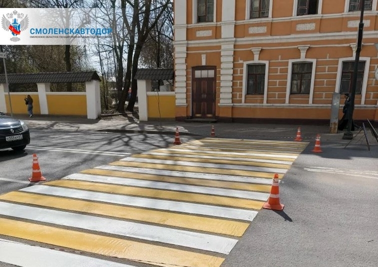 В Смоленске в минувшие выходные специалисты «Смоленскавтодора» приступили к работам по обновлению разметки на пешеходных переходах.