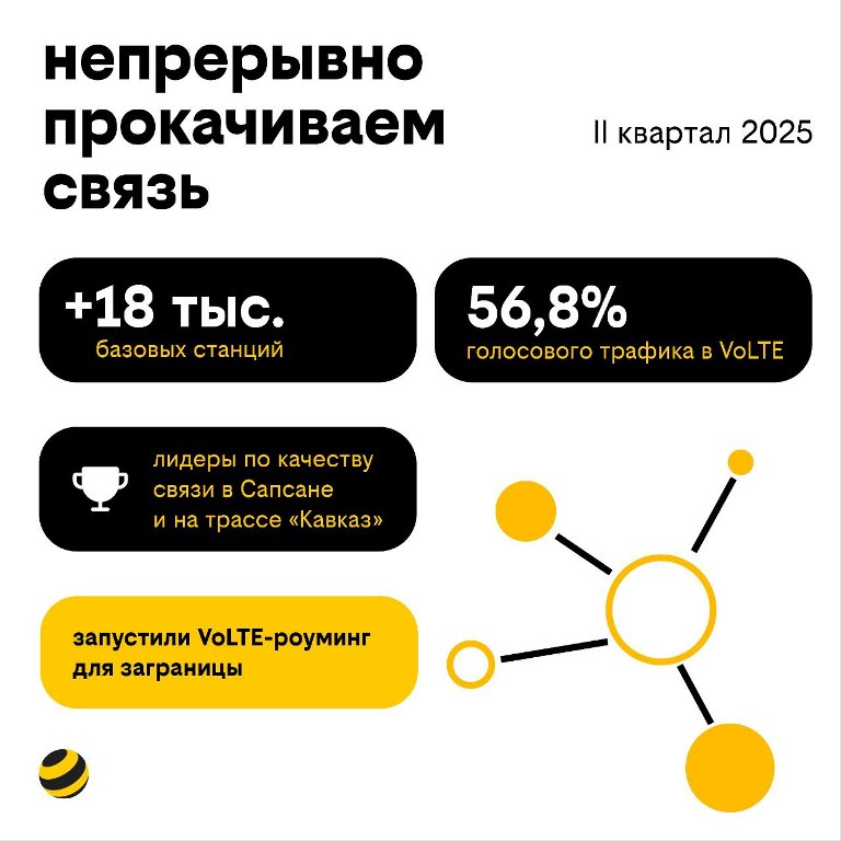 Компания продолжает масштабировать сеть: за год количество базовых станций увеличилось на 8,7% (плюс 18 тысяч), объём дата-трафика вырос на 11,2%, доля VoLTE в голосовом трафике – на 10,9 п.п. Запущен VoLTE-роуминг за рубежом, введены новые магистральные ВОЛС ёмкостью 1,6 Тбит/с, укреплена надёжность ЦОД в Ярославле и запущен георезервный сайт в Москве.