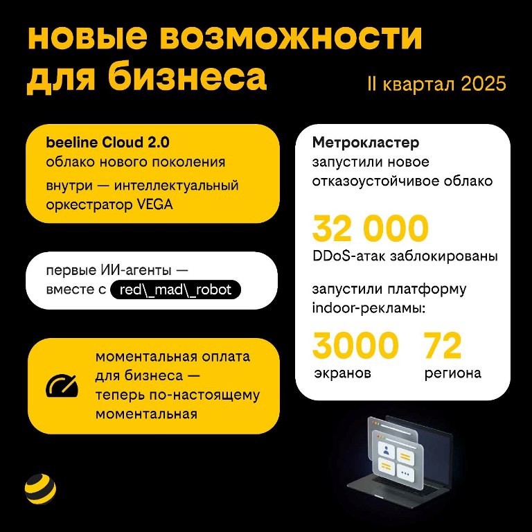Среди продуктовых новинок – перезапуск платформы «план б.» с доступом к нейросетям, расширение семейной опции «Семья в Билайне» до 10 номеров, запуск услуги Branded Call, кешбэк в «Пятёрочке» и «Перекрёстке» в «Апельсиновом КОМБО», обновлённые «Книги Билайн» с ИИ-помощником и новые тарифы для бизнеса.