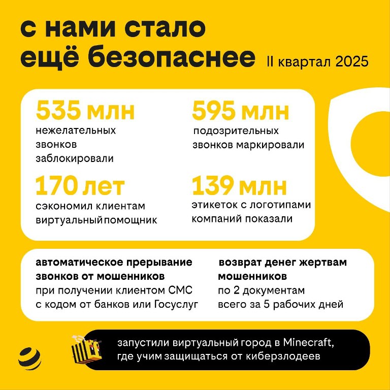 В области безопасности за квартал заблокировано 535 млн нежелательных звонков, маркировано почти 600 млн подозрительных вызовов и внедрены новые механизмы защиты от мошенников, включая автоматическое прерывание звонка, если в этот момент приходит код от банка или Госуслуг. Для обучения кибербезопасности создан виртуальный город в Minecraft.