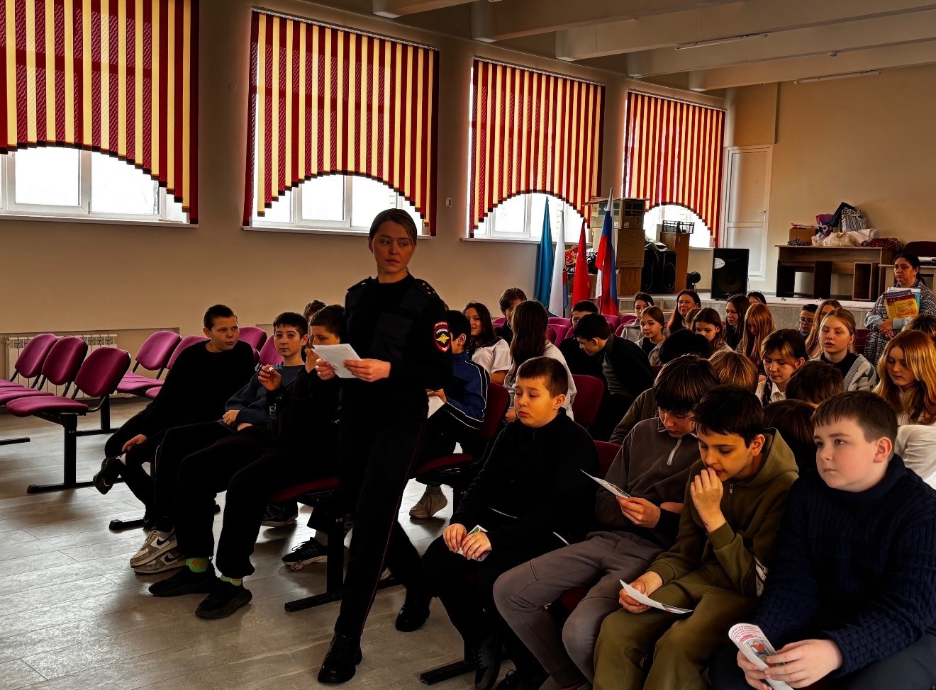 В беседе с ребятами из 6-8 классов, которых собралось около 175 человек, полицейские рассказали о том, насколько опасно находиться вблизи поездов и на самих железнодорожных путях. Особое внимание уделили теме зацепинга – рискованного катания на поездах, которое может привести к очень серьёзным последствиям.