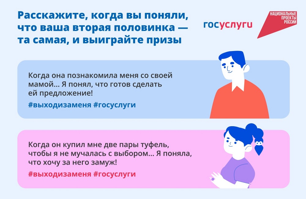 Для участия необходимо на своей странице в социальной сети ВКонтакте написать душевный пост, посвящённый отношениям с любимым человеком, поставить хэштеги #ВыходиЗаМеня и #Госуслуги, а также подписаться на паблик Госуслуг.