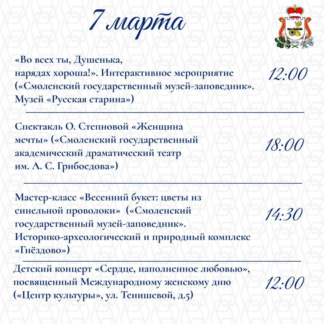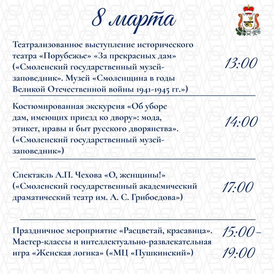 В предстоящие праздничные дни в Смоленской области пройдут мероприятия, посвящённые Международному женскому дню. Среди них – спектакли, концерты, выставки, акции, экскурсии, интерактивные мероприятия.