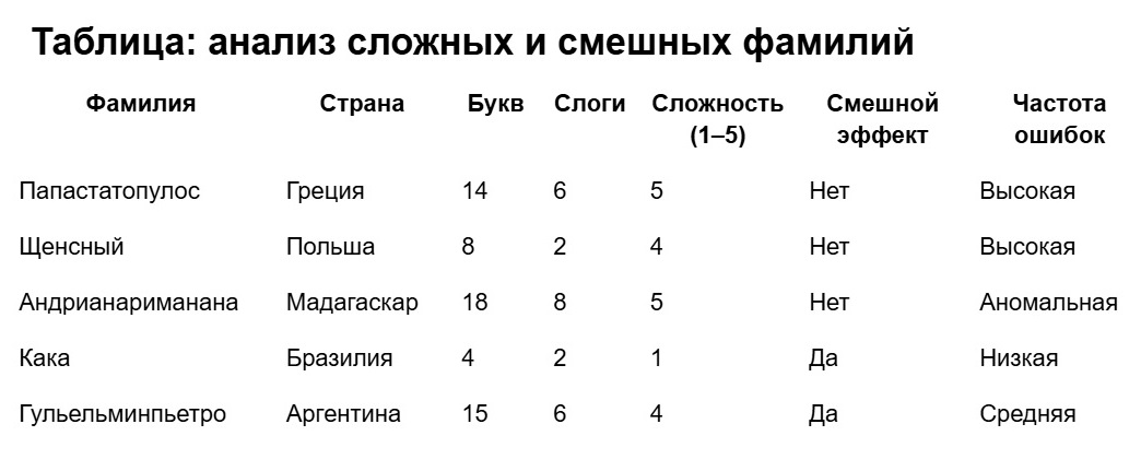 Сложные фамилии футболистов — это не только лингвистический вызов, но и часть футбольной культуры. Они делают игроков уникальными, подчёркивают разнообразие мира и добавляют игре колорит. Футболисты со смешными фамилиями, такие как Кака, привносят юмор, но требуют уважительного отношения. Комментаторам и болельщикам остаётся одно: тренироваться, адаптироваться и наслаждаться игрой, ведь футбол — это эмоции, в которых даже фамилия может стать легендой.