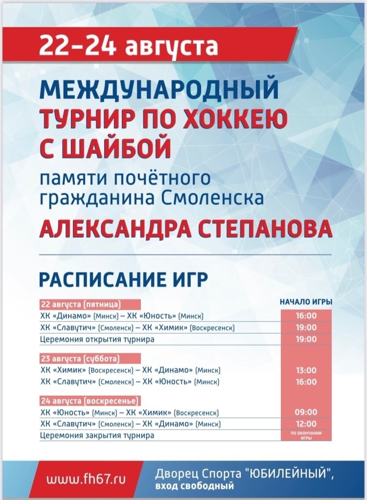 С 22 по 24 августа во Дворце спорта «Юбилейный» состоится IV Международный турнир по хоккею с шайбой среди юношеских команд памяти почётного гражданина города Смоленска Александра Степанова.