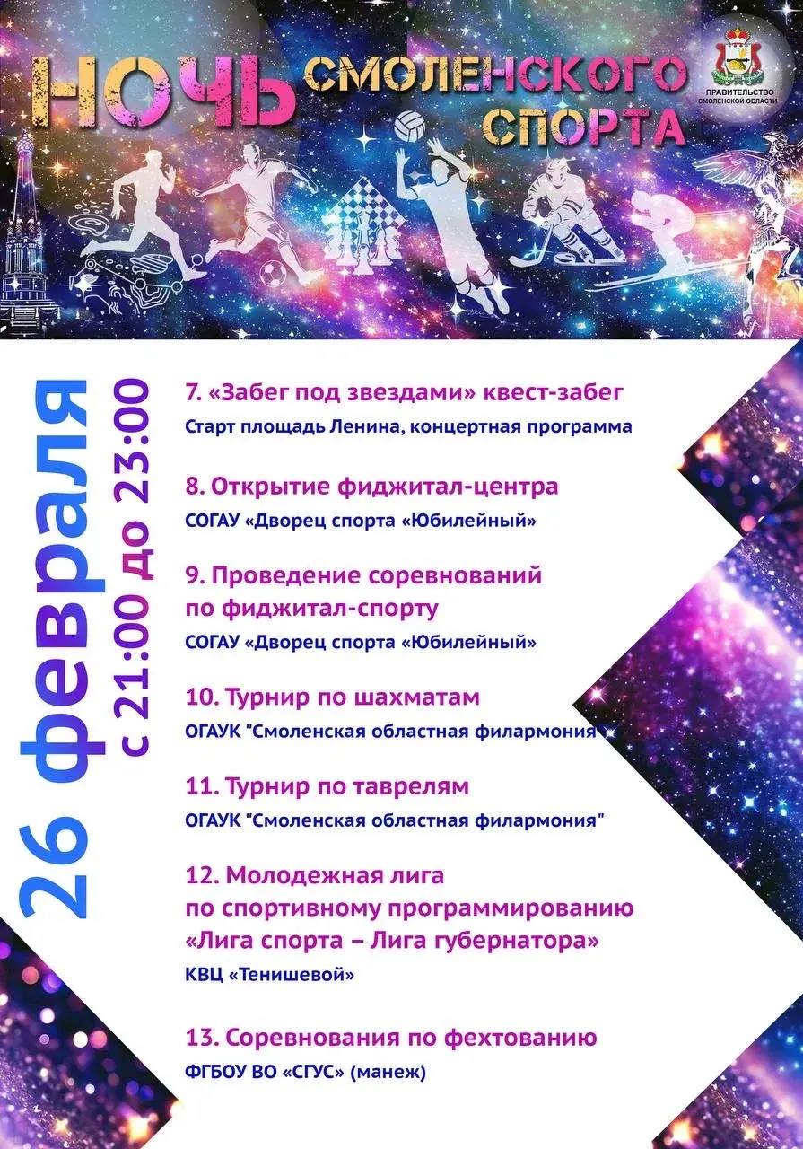 С 21:00 до 23:00 во Дворце спорта «Юбилейный» состоятся тренировки в тренажёрном зале и плавательном бассейне, также в 18:35 состоится торжественное открытие нового фиджитал-центра. На ледовой арене Смоленского государственного университета спорта будет организовано массовое катание на коньках.