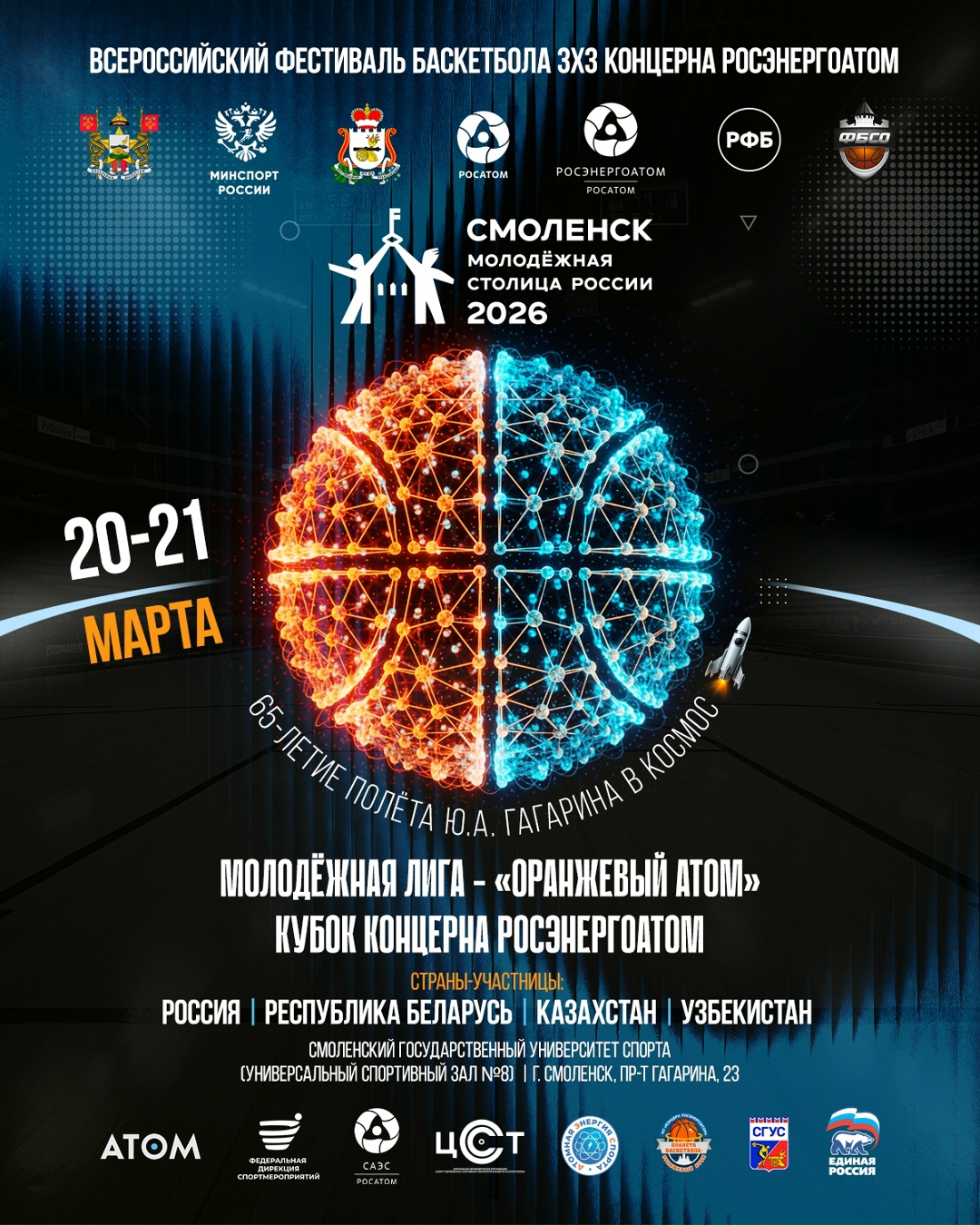 В Смоленске пройдут всероссийские соревнования по баскетболу 3х3 концерна «Росэнергоатом» — Молодёжная лига «Оранжевый атом», приуроченные к празднованию 65-летия первого полёта человека в космос. Первый тур состоится 20—21 марта на базе Смоленского государственного университета спорта. В соревнованиях будут участвовать 40 мужских и женских команд из 12 регионов России, Республики Беларусь, Узбекистана и Казахстана. Начало — в 10:00. Вход свободный (6+).