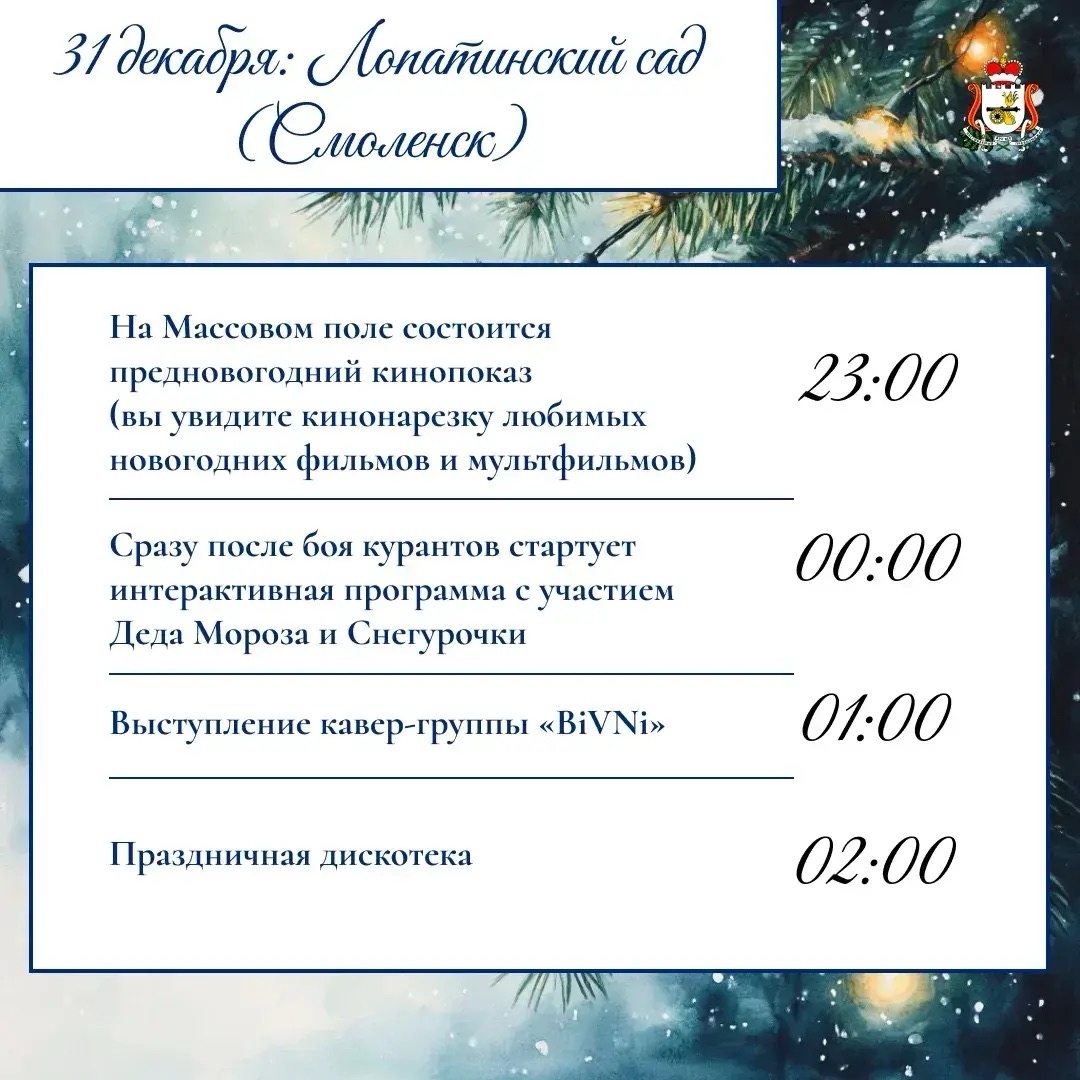 Главной площадкой новогодних гуляний в городе Смоленске станет Лопатинский сад. 31 декабря в 23:00 на Массовом поле пройдёт кинопоказ под открытым небом. Ровно в полночь смолян и гостей города ждёт интерактивная программа с Дедом Морозом и Снегурочкой. Продолжением праздника станет выступление кавер-группы "BiVNi". Новогодняя ночь завершится дискотекой.